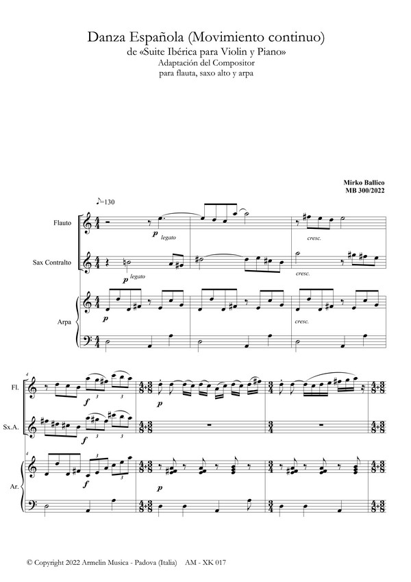 De «Suite Ibérica para Violin y Piano». Adaptación del Compositor para flauta, saxo alto y arpa. Partitura y partes