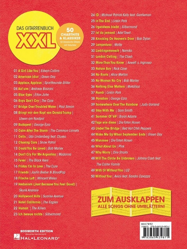 Endlich liegt auch für Gitarre ein Songbook im XXL-Format vor. Die ausklappbaren Seiten ermöglichen eine übersichtliche Darstellung der Tabulaturen ganz ohne Umblättern. Die praktische Spiralbindung erleichtert die Handhabung zusätzlich. Auch die Songauswahl kann sich sehen lassen. Rock-Klassiker wie Nothing Else Matters(Metallica) oder With Or Without You(U2) wie auch Hits der letzten Jahre No Roots (Alice Merton), Lieblingsmensch (Namika) oder Paradise (George Ezra) finden sich im Buch gleichermaßen wieder und wurden speziell für die klassische Gitarre ausgewählt. Weitere Highlights aus 50 Songs: Applaus, Applaus (Sportfreunde Stiller), Friday Im In Love (The Cure), Hedonism (Just Because You Feel Good) (Skunk Anansie). 50 Charthits und Klassiker A Girl Like You American Idiot Applaus, Applaus Auf uns Blue Eyes Boys Dont Cry Bridge Over Troubled Water Bringt mir den Kopf von Donald Trump Budapest Calm After The Storm Cello Chasing Cars Could You Be Loved Dont Cry For Me Argentina Fever Friday Im In Love Friends Frische Luft Hedonism (Just Because You Feel Good) Hollywood Hills Hotel California Human Ich bereue nichts iD In The End Irgendwas bleibt Ist da jemand Knocking On Heavens Door Lampedusa Lieblingsmensch London Calling More Than You Know Nature Boy No Roots No Woman No Cry Nothing Else Matters Numb Paradise Somewhere Over The Rainbow Stay With Me Summer Of 69 Tage wie diese Under The Bridge Wake Me Up When September Ends Wannsee What About Us Why Worry Will The Circle Be Unbroken? With Or Without You Without You