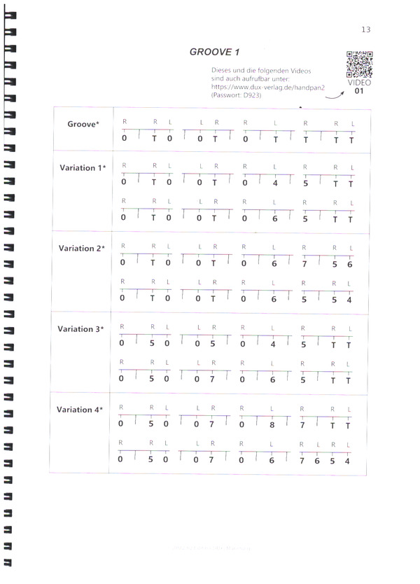 für leicht fortgeschrittene Spieler Das Handpanbuch 2 von Daniel Giordani beinhaltet, aufbauend auf den grundlegenden Spieltechniken, viel neues Material zum Spielen und Lernen. Mit den zahlreichen Übungen können leicht fortgeschrittene Handpanspieler ihre Spieltechnik weiterentwickeln, mehr Flexibilität am Instrument bekommen und ihren musikalischen Ausdruck verbessern. Alle Übungen sind mit einer schlichten und leicht verständlichen Notation dargestellt und mit den unterschiedlichsten Handpan-Skalen umsetzbar. Das Buch bietet viele neue spannende Grooves sowie Übungen zu Paradiddles, Triolen, Rolls, Wirbel und Flams. Neue Soundmöglichkeiten, wie isolierte Obertöne oder perkussive Sounds mit der Faust und den Fingerknöcheln, werden erkundet. Durch zahlreiche 4er- und 3er-Rhythmusübungen werden Timing und Koordination gefestigt und geschult. Acht schöne und abwechslungsreiche Übungsstücke bieten die Möglichkeit, die erlernten neuen Techniken zu trainieren und musikalisch umzusetzen. Mehr als 30 verlinkte Online-Videos geben neben den Erklärungen und Übungen eine sehr gute zusätzliche Lernhilfe. 1. EINLEITUNG Neues aus der Handpanwelt 2. BEGRIFFSERKLÄRUNG Notation Symbole der Sounds Symbole für den Handsatz Pulsationsschrift versus klassische Notation 3. GROOVEBOX Groove 1 Groove 2 Groove 3 Groove 4 Groove 5 Groove 6 Groove 7 Exkurs 1 - Rhythmusübungen 4. PARADIDDLE Der Para-Paradiddle 5. TRIOLEN 6. ROLLS Dreier-Rolls Vierer-Rolls 7. DIE MAGIE DER 12 Alles Walzer Exkurs 2 - Rhythmusübungen Dreierlei Exkurs 3 - Rhythmusübungen Taran-Tarantella Exkurs 4 - Rhythmusübungen Veränderungen im Betonungsmuster Koordinationsübungen 8. FLAM Der einfache Flam Der doppelte und dreifache Flam 9. DER KNACKSOUND MIT DEN KNÖCHELN 10. DER BASS-SOUND MIT DER FAUST 11. DER WIRBEL MIT RINGFINGER UND DAUMEN 12. ISOLIERTE OBERTÖNE 13. UNABHÄNGIGKEITSÜBUNGEN Einfache Pendelbewegung plus Melodie Komplexere Pendelbewegung plus Melodie Wechselnde Pendelbewegung plus Melodie Lange Pendelbewegung plus Melodie Viererbewegung plus Melodie Die Pendelbewegung in anderen Taktarten Exkurs 5 - Rhythmusübungen 14. ÜBUNGSSTÜCKE 1. TRACES ON MY WAY 2. LA PIUMA BIANCA 3. JUNGLE SPIRIT 4. A WALTZ FOR YOU 5. SOFT LANDING 6. NIGHTFALL TWILIGHT 7. DREAM WEAVER 8. BREAKING THE CHAINS ANHANG Symbole und Begriffe der Notation Liste der Videos