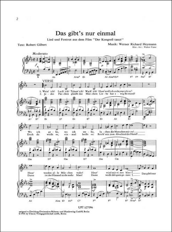 Das ist die Liebe der Matrosen Das muß ein Stück vom Himmel sein Du bist das süßeste Mädel der Welt Du hast mir heimlich die Liebe ins Haus gebracht Eine Nacht in Monte Carlo Ein Freund ein guter Freund Es führt kein and'rer Weg zur Seligkeit Hallo du süße Frau ! Hoppla jetzt komm ich Irgendwo auf der Welt Liebeswalzer Liebling mein Herz läßt dich grüssen Wenn der Wind weht Wir zahlen keine Miete mehr