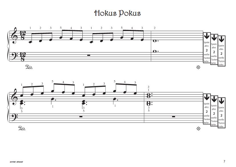 Das magische Klavier ist als spielerischer, motivierender Ergänzungsband zu den gängigen Klavierschulen gedacht. Das Buch beinhaltet 18 sehr leichte klassische und modern klingende Vortragsstücke für Anfänger, die viel Spaß machen. Kurze und schön klingende Sequenzen werden einfach nur verschoben und können schnell auswendig gespielt werden. Dadurch werden Ausdruck, Pedalspiel und Dynamik schon früh vermittelt und die Fingerfertigkeit wird geschult. Die Stücke sind immer zuerst in einer kurzen VerschiebeVersion und danach noch mal in einer ausgeschriebenen Version notiert. Sie bieten viel Klangerlebnis bei vergleichsweise sehr leichtem technischen Schwierigkeitsgrad. Selbstverständlich besteht für jeden die Möglichkeit, die Stücke für sich selbst zu entdecken und je nach Können und Geschmack auf persönliche Weise zu interpretieren. Leichte zauberhafte Stücke zum Auswendigspielen Abrakadabra Hokus Pokus Magische Hände Simsalabim Der Kartenspieler Gaukler (Gauckler) Der fliegende Besen Hex Hex Der Magier Zauber aus dem Hut Merlin Schwarzer Kater Weiße Katze Der Zauberlehrling Der verschwundene Hase Die schwebende Frau Illusion Zauberei