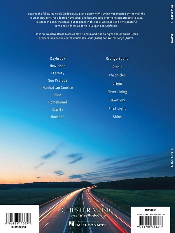 Dawn is the follow-up to Ola Gjeilo's 2020 piano album Night, which was inspired by the twilight hours in New York, his adopted hometown, and has amassed over 50 million streams to date. Released in 2022, the sequel put to paper in this book was inspired by the peaceful light and stillness at dawn in Oregon and California. Ola is an exclusive Decca Classics artist, and in addition to Night and Dawn his Decca projects include the choral albums Ola Gjeilo (2016) and Winter Songs (2017).