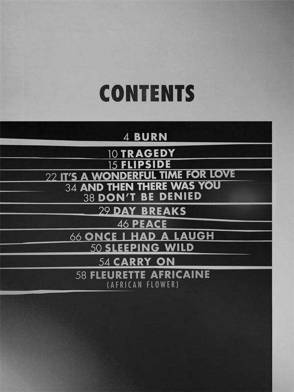 Burn Tragedy Flipside It's a wonderful Time for Love And then there was You Don't be denied Day breaks Peace One I hd a Laugh Sleeping wild Carry on Fleurette africaine