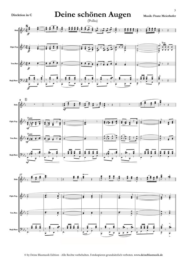 Wenn der österreichische Komponist Franz Meierhofer ('Traum einer Marketenderin'), dessen Herz für die böhmische Blasmusik schlägt, an seine Liebste denkt, ist dies Inspiration genug. Mit 'Deine schönen Augen', einer Hommage an seine Muse, zeigt Meierhofer einmal mehr, dass er ein Meister seines Genres ist. Seine wunderschönen und eingängigen Melodienbögen fügen sich zusammen zu einem fröhlichen Reigen, der zum Tanzen einlädt.