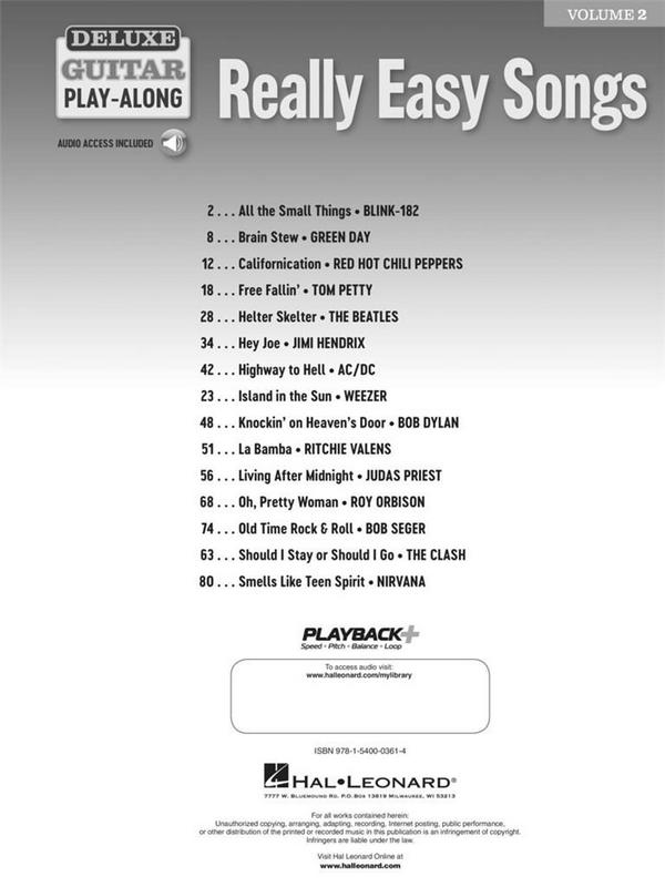 Play 15 Songs with Backing Tracks All The Small Things Brain Stew Californication Free Fallin' Helter Skelter Hey Joe Highway To Hell Island In The Sun Knockin' On Heaven's Door La Bamba Living After Midnight Oh, Pretty Woman Old Time Rock & Roll Should I Stay Or Should I Go Smells Like Teen Spirit