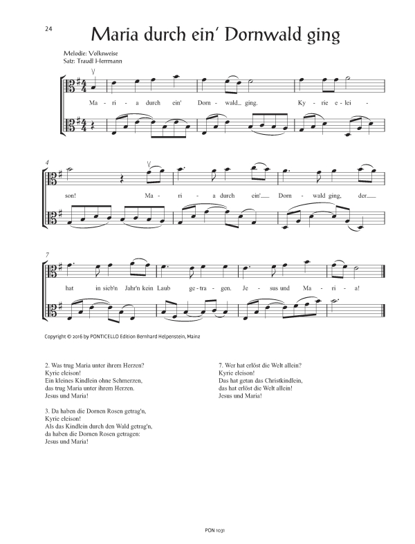 24 Weihnachtslieder in phantasievollen Sätzen von Traudl Herrmann für Bratsche Die vorliegende Sammlung traditioneller Weihnachtslieder in Form von Duos mit zweiter Stimme für Fortgeschrittene entstand aus einem echten Bedürfnis nach musikalisch anspruchsvoller Literatur für die Weihnachtszeit. Die Duos sind sehr vielseitig einsetzbar durch das verschiedene Niveau der beiden Stimmen. So können z.B. Anfänger mit Fortgeschrittenen oder Schüler mit Lehrern musizieren. Bei gleichstarken Partnern kann man strophenweise die erste und zweite Stimme tauschen. Für (vor-)weihnachtliches Musizieren zuhause ebenso geeignet wie für Aufführungen im Konzertsaal, stellen diese Duos eine klare Bereicherung für die Weihnachtszeit dar. Diese Ausgabe kann auch zusammen mit derjenigen für zwei Violoncelli (PON 1032) gespielt werden. Die Violinausgabe (PON 1030) steht eine Quinte höher. Hierzu ist aber über den Downloadbereich der Verlagswebseite eine Melodiestimme als kostenlose PDF-Datei erhältlich, die mit den Ausgaben für Violoncello und Viola kombinierbar ist. Joy to the world (nach Psalm 98) O Tannenbaum Es ist ein Ros entsprungen Es wird scho glei dumpa (Es wird schon gleich dunkel) Alle Jahre wieder Kling, Glöckchen Lieb Nachtigall, wach auf Vom Himmel hoch, da komm ich her Inmitten der Nacht Fröhliche Weihnacht überall O Heiland, reiß die Himmel auf Leise rieselt der Schnee Was soll das bedeuten Stille Nacht, heilige Nacht Ihr Kinderlein kommet O du fröhliche (O Sanctissima) Guten Abend, gut' Nacht In dulci jubilo Am Weihnachtsbaum die Lichter brennen Kommet, ihr Hirten Les anges dans nos campagnes (Engel lassen laut erschallen) Schneeflöckchen, Weißröckchen Süßer die Glocken nie klingen Maria durch ein Dornwald ging