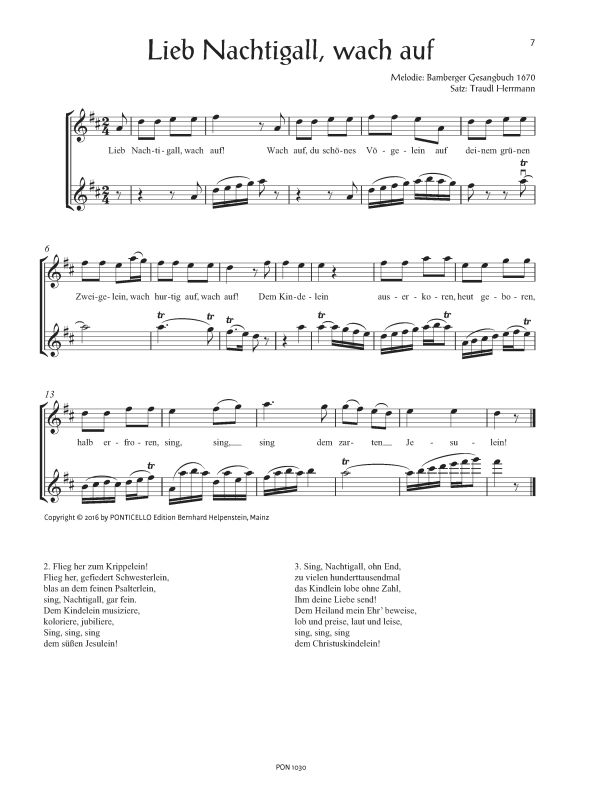 24 Weihnachtslieder in phantasievollen Sätzen von Traudl Herrmann Die vorliegende Sammlung traditioneller Weihnachtslieder in Form von Duos mit zweiter Stimme für Fortgeschrittene entstand aus einem echten Bedürfnis nach musikalisch anspruchsvoller Literatur für die Weihnachtszeit. Die Duos sind sehr vielseitig einsetzbar durch das verschiedene Niveau der beiden Stimmen. So können z.B. Anfänger mit Fortgeschrittenen oder Schüler mit Lehrern musizieren. Bei gleichstarken Partnern kann man strophenweise die erste und zweite Stimme tauschen. Für (vor-)weihnachtliches Musizieren zuhause ebenso geeignet wie für Aufführungen im Konzertsaal, stellen diese Duos eine klare Bereicherung für die Weihnachtszeit dar. Für das Zusammenspiel mit den Ausgaben für 2 Celli PON 1032) oder 2 Bratschen (PON 1031) ist über den Downloadbereich der Verlagswebseite eine Melodiestimme als kostenlose PDF-Datei erhältlich. Joy to the world (nach Psalm 98) O Tannenbaum Es ist ein Ros entsprungen Es wird scho glei dumpa (Es wird schon gleich dunkel) Alle Jahre wieder Kling, Glöckchen Lieb Nachtigall, wach auf Vom Himmel hoch, da komm ich her Inmitten der Nacht Fröhliche Weihnacht überall O Heiland, reiß die Himmel auf Leise rieselt der Schnee Was soll das bedeuten Stille Nacht, heilige Nacht Ihr Kinderlein kommet O du fröhliche (O Sanctissima) Guten Abend, gut' Nacht In dulci jubilo Am Weihnachtsbaum die Lichter brennen Kommet, ihr Hirten Les anges dans nos campagnes (Engel lassen laut erschallen) Schneeflöckchen, Weißröckchen Süßer die Glocken nie klingen Maria durch ein Dornwald ging