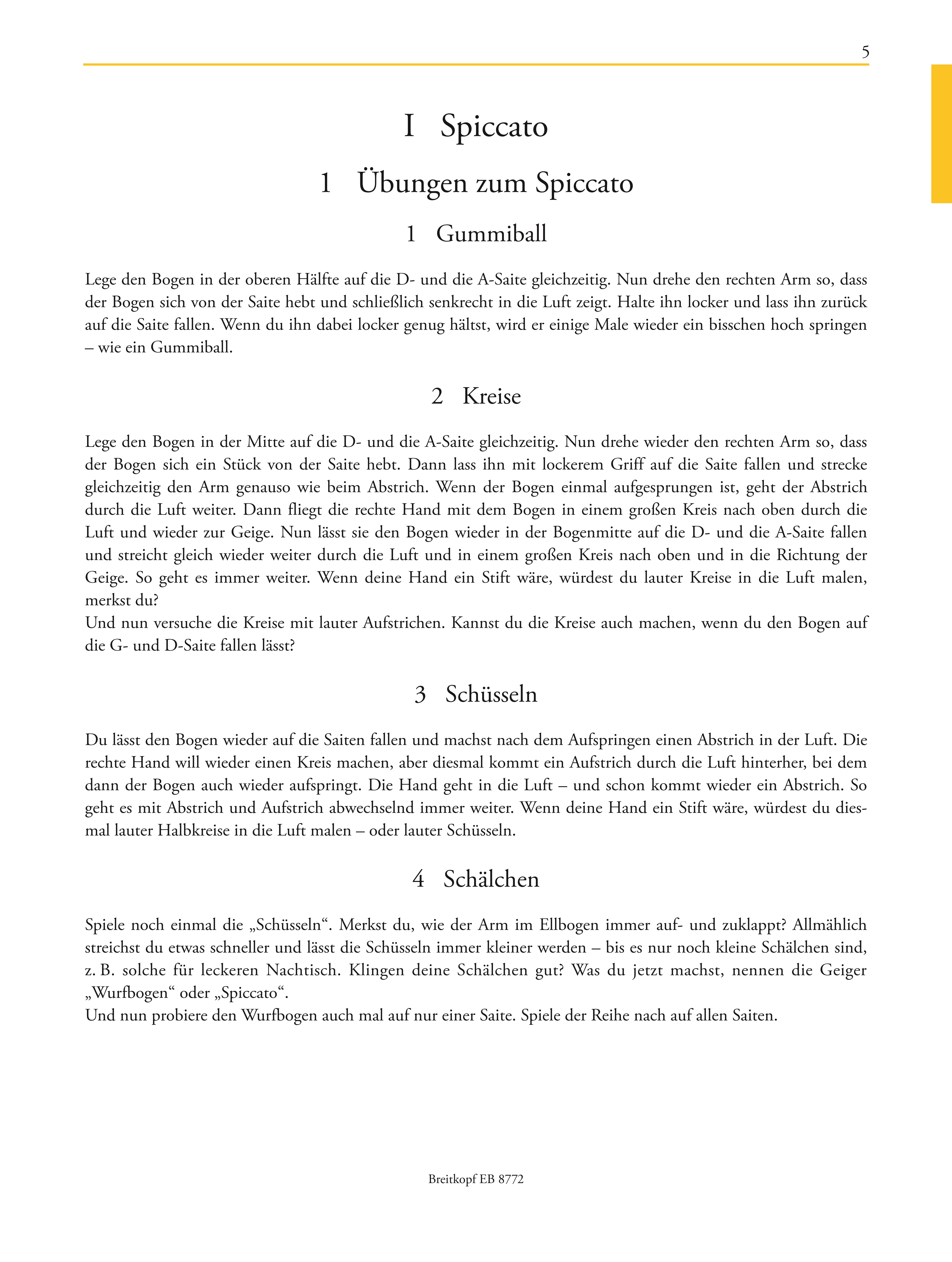 Materialien für den Violinunterricht Der Geigenkasten bietet eine Fülle vielfältigster Materialien für den Violinunterricht. Er lässt sich als didaktischer Fundus zusätzlich zu jeder Geigenschule einsetzen, eignet sich aber auf Grund des ansteigenden Schwierigkeitsgrades innerhalt der Kapitel auch als Leitfaden für den Unterricht in der Art einer Violinschule. Heft 1 (EB 8771): Streichen, Greifen, Spielen die ersten Schritte Die einzelnen Abschnitte widmen sich den Themen Haltungs- und Bewegungsspiele Musik mit leeren Saiten und Grundlagen der Bogentechnik (in der Mitte, am Frosch, an der Spitze und an wechselnden Bogenstellen) Greifen in der ersten, zweiten und dritten Griffart sowie mit tiefem ersten Finger Verbindung der Griffarten und Chromatik Rhythmen spielen, lesen, notieren Töne lesen und notieren sowie im Kapitel Musik erfinden der Improvisation. Fast immer gibt es zweite Stimmen zum gemeinsamen Musizieren und Texte zum Singen. Auf diese Weise stellt das Heft Lieder und Violinstücke zu verschiedenen Anlässen und zum Jahreskreis bereit. Zwischendurch ist Wissenswertes zur Geige eingestreut. Ergänzend stehen zwei Ordner mit Audiotracks im MP3-Format zu EB 8771 zum Download bereit. Der erste, Stimmen und Spielen, enthält die Töne der leeren Saiten zum häuslichen Einstimmen sowie 25 Lieder aus dem Heft zum Anhören und Mitspielen. Der zweite Ordner, Im Konzert, enthält eine Auswahl an Violinmusik verschiedenster Stilbereiche. Dabei gibt es vielerlei thematische Bezüge zu Stücken des Heftes zu entdecken. Heft 2 (EB 8772) beschäftigt sich wiederum mittels kurzer zweistimmiger Musizier-Stücke mit dem Lagenspiel (Lagenwechsel, zweite, dritte, vierte und halbe Lage), dem Vibrato und dem Spiccato. Zum Lagenwechsel, einem der zentralen Themen der Streicherpädagogik, enthält der Band ein vertiefendes Lagen-Fitnessprogramm zum Herausnehmen. Heft 3 (EB 8773) schließlich führt in die Stile vom Frühbarock bis zur Gegenwart ein und erweitert die Technik mit Laufwerk, Doppelgriffen und hohen Lagen in Richtung eines virtuoseren Spiels. Der Geigenkasten (Heft 1) wurde 2005 mit dem Deutschen Musikeditionspreis ausgezeichnet.