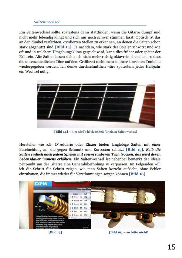 Die besten Tipps und Tricks rund um die Pflege und Einstellung deiner Gitarre. Wie ziehe ich Saiten richtig auf? Womit pflege ich meine Gitarre und wie bewahre ich sie auf? Wie stelle ich sie individuell ein? Welche Reparaturen kann ich selbst durchführen? Mit über 150 Farbfotos 100% Know-how Hier findest Du alle Antworten zur Akustik-Gitarre, E-Gitarre & Bass. Anschauliche Erklärungen leiten Dich mit vielen Bildern zur dauerhaft stimmstabilen Gitarre mit optimalem Spielkomfort und verbessertem Sound. Mehr Spaß beim Spielen durch wertvolle Tipps & Tricks für Anfänger, Fortgeschrittene und erfahrene Musiker! Vorwort Aufbau (Konzertgitarre/Klassische Gitarre, Westerngitarre, E-Gitarre, E-Gitarre mit Double-Locking-System) Stimmen Saiten Saitenwechsel (Konzertgitarre, Westerngitarre, E-Gitarre, E-Gitarre mit Floyd Rose-Vibrato) Aufbewahrung & Pflege (Aufbewahrung, Luftfeuchtigkeit, Reinigung und Materialpflege) Optimale Einstellung der Gitarre (Halskrümmung, Saitenlage, Intonation, Vintage-Vibratosystem, Double-Locking-Vibratosystem, Tonabnehmer bei E-Gitarren) Behandlung typischer Problemfälle (Bünde abrichten, überstehende, scharfkantige Bunddrähte, Dead Spots, kratzende Potis, Rückkopplung und starkes Rauschen aus dem Verstärker, Security Locks, Fehlersuche, Einschwingen, ein letzter Rat Glossar (Begriffserklärungen)