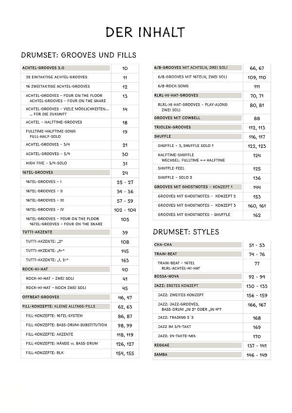 2 Schritte weiter für alle Schlagzeugschule für Kinder Es geht vor allem ums Drumset: Grooves, Fills, Soli, Play-Alongs, Spieltechniken, Koordination und Unabhängigkeit. Stilistisch liegt der Schwerpunkt auf Rock/Pop, aber auch Styles wie Cha-Cha, Bossa Nova, Samba, Reggae oder Jazz kommen nicht zu kurz. Für Open-Handed-Playing als auch das Überkreuzt-Spielen gleichermaßen gut geeignet. Zahlreiche Play-Alongs in jeweils 3 Tempostufen, gespielt von hervorragenden Musikern. Sorgfältig ausgewählte Links verweisen per QR-Code auf viele Mitspielmöglichkeiten mit Original-Songs. Klassische Handtechniken wie Akzente, Flams oder Wirbel werden in Übungen und Soli gründlich durchgenommen.