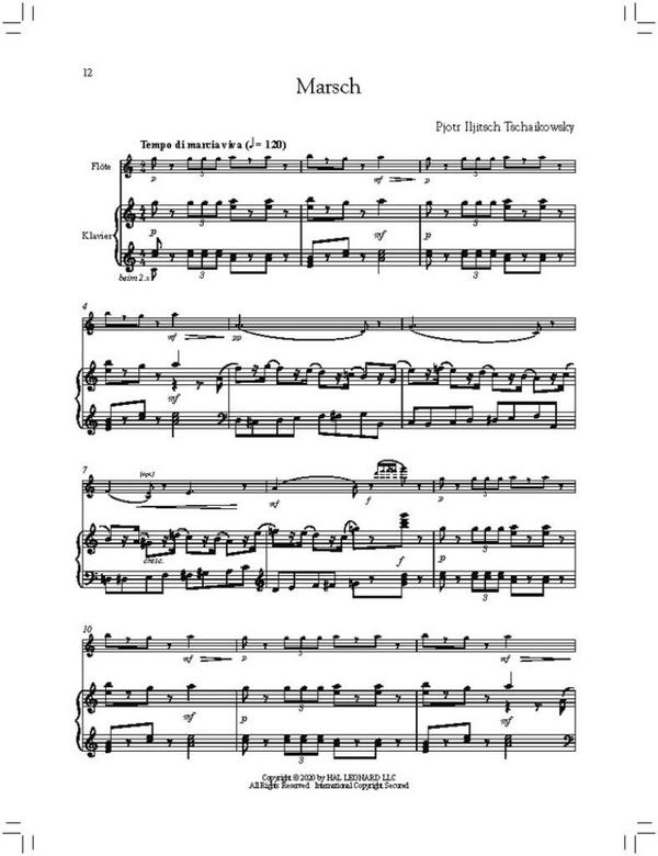 10 Auszüge aus der Ballettmusik Tschaikowskys Musik zu "Der Nussknacker" gehört zu den populärsten Ballettmusiken überhaupt und war schon zu seinen Lebzeiten ein großer Erfolg. Kein Wunder, dass schon der Komponist selbst die beliebtesten Nummern daraus zu einer Orchestersuite zusammenfasste. Eben diese Auswahl, ergänzt um zwei weitere Nummern aus der originalen Ballettmusik, bildete die Grundlage für die vorliegenden Soloarrangements im anspruchsvollen Schwierigkeitsgrad für Flöte und Klavier, deren Tonumfang die schönsten Klangfarben der Flöte zur Geltung bringt. Mit zusätzlichen Angaben zu Dynamik, Artikulation und Phrasierung versehen, eignet sich die Musik hervorragend für den Unterricht und für Aufführungen. Die online zugänglichen Begleitungen wurden auf einem akustischen Flügel eingespielt. 1. Miniatur-Ouvertüre 2. Marsch 3. Pas de deux 4. Spanischer Tanz (Schokolade) 5. Tanz der Zuckerfee 6. Russischer Tanz (Trepak) 7. Arabischer Tanz (Kaffee) 8. Chinesischer Tanz (Tee) 9. Tanz der Rohrflöten 10. Blumenwalzer