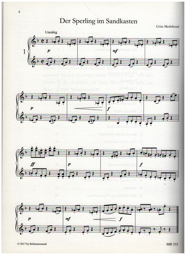 20 kuriose Klavierstücke für Groß und Klein Der Sperling im Sandkasten Mäusetänzchen Der Spatz im Regen Der kleine Kobold Huckepack Ungeduldig Kobold-Streiche Verstecken im Laub Wind im Schilf Tanzender Mückenschwarm Der Mistkäfer tanzt Marsch in den Gänsestall Über Stock und Stein Traum Freier Nachmittag Der Flaschenteufel Unschlüssig Die Mücke auf der Zwiebelschale Harlekin Der Maikäfer im Pflaumenbaum