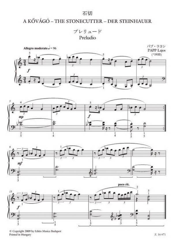 13 kleine Klavierstücke für Anfänger nach einem japanischen Märchen Der Steinhauer Der hohe felsen Der Bergkobold Der prunkvolle Palast Der Gutsbesitzer in der Kutsche Der strahlende Sonne Sonnenmusik Die Wolke Sturm und dichter Regen Der felsen Der Steinhauer 2 Lied des glücklichen Steinhauers