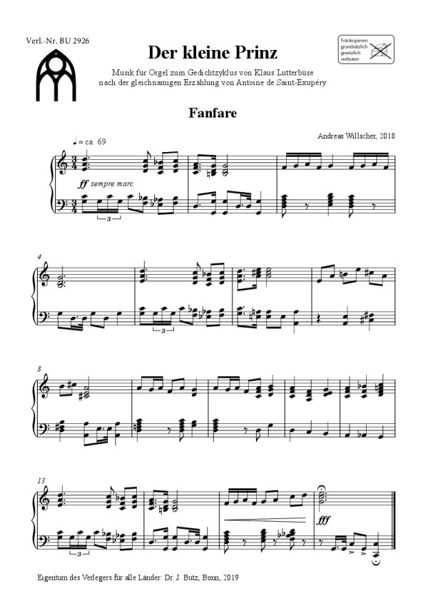 15 Orgelstücke nach Gedichten von Klaus Lutterbüse Fanfare Der kleinePrinz In der Wüste Sonnenuntergänge Die Kathedrale der Affenbrotbäume Königliches Thema Sterne Laternen Lamento. Passacaglia Von den Blumen Vom Fuchs, Toccatina Verlorenes Glück? Weichensteller Von Wüsten und Nattern Coda