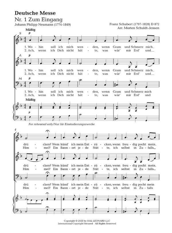 Die SAM-Klang Serie bietet ein Basisrepertoire für Chöre in der Besetzung Sopran, Alt und einer Männerstimme. Der 29-jährige Franz Schubert komponierte im Jahre 1826 seine Deutsche Messe (D 872) im Auftrag von Johann Philipp Neumann, der auch den Text mit dem Originaltitel "Gesänge zur Feier des heiligen Opfers der Messe" verfasste. Namensgebend für die Messe war der Umstand, dass hier anders als in den meisten geistlichen Werken jener Zeit - die deutsche Sprache verwendet wird. Die große Popularität der Messe erklärt sich sicherlich vorrangig durch die schlichte und einprägsame Musik Schuberts, ein weiterer Grund könnte aber auch sein, dass die deutschen Texte im Gegensatz zu den tradierten lateinischen Messtexten eher den Menschen mit seinen irdischen Sorgen und Nöten ins Zentrum rücken. Dies dürfte auch Schuberts eigene religiöse Überzeugung angesprochen haben. Inhalt: 1. Zum Eingang 2. Zum Gloria 3. Zum Evangelium und Credo 4. Zum Offertorium 5. Zum Sanctus 6. Nach der Wandlung 7. Zum Agnus Dei 8. Schlussgesang 9. Das gebet des Herrn (Anhang)
