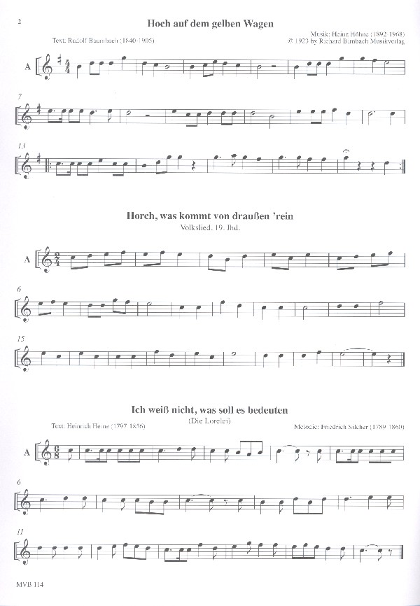 Bornmann, Johannes, arr. Hoch auf dem gelben Wagen Horch, was komm von draußen rein Ich weiß nicht, was soll es bedeuten Im Frühtau zu Berge Im schönsten Wiesengrunde Im tiefen Keller In einem kühlen Grunde Innsbruck, ich muss dich lassen Kein schöner Land Komm, lieber Mai Nun ruhen alle Wälder Nun will der Lenz uns grüßen Sah ein Knab ein Röslein steh'n Schwarzbraun ist die Haselnuss Spinn, spinn, meine liebe Tochter Waldeslust Weißt du, wieviel Sternlein stehen Wer nur den lieben Gott lässt walten Wie schön leuchtet der Morgenstern Wir lieben die Stürme Wohlan, die Zeit ist kommen