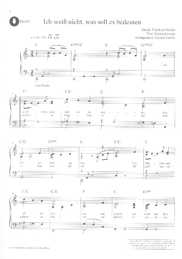 Piano Lounge Gerlitz, Carsten, arr. 16 Melodien im Bar-Piano-Stil Ich weiß nicht was soll es bedeuten Kommt ein Vogel geflogen Wenn ich ein Vöglein wär Abend wird es wieder Es waren zwei Königskinder Die Gedanken sind frei Leise zieht durch mein Gemüt Kein Feuer keine Kohle Wach auf mein Herzens Schöne Am Brunnen vor dem Tore Ade zur guten Nacht In einem kühlen Grunde Der Mond ist aufgegangen Komm lieber Mai und mache Kein schöner Land Hab oft im Kreise der Lieben