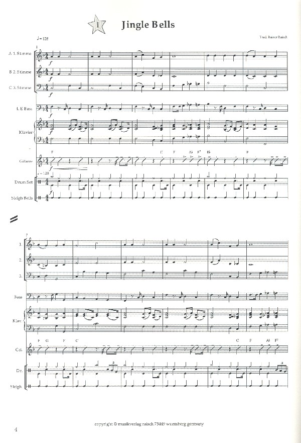 Achtung: nicht kombinierbar mit den Ausgaben für Blasorchester!!! Raisch, Rainer, arr. Jingle Bells Alle Jahre wieder Lasst uns froh und munter sein Morgen kommt der Weihnachtsmann Fröhliche Weihnacht überall Kling Glöckchen Stille stille kein Geräusch gemacht O du fröhliche Go tell it on the Mountain Joy to the World Lobt Gott ihr Christen Gloria der Engel auf den Feldern Leise rieselt der Schnee O Tannenbaum The first Noel Es ist ein Ros entsprungen Schneeflöckchen Weissröckchen Deck the Halls Süßer die Glocken nie klingen Christmas Medley