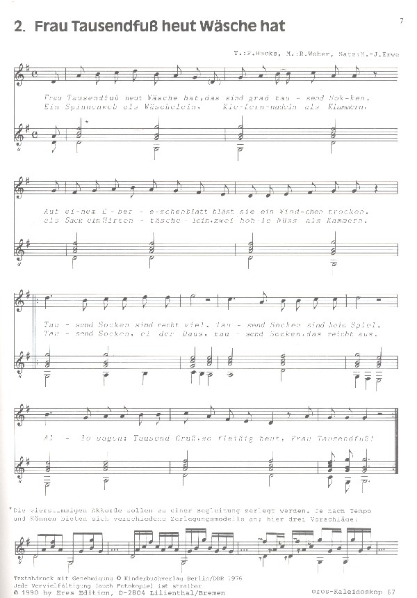 Hacks, Peter, Text Erwe, Hans-Joachim, Gitarrensaetze Die Blätter in meinem Kalender Frau Tausendfuss heut Wäsche hat Das Lied vom schnellen Hasen Der blaue Hund Lied der Ameisen beim Zweigleinheben Trip trip trop Wiese grüne Wiese Gletscherzwerg Die kleine Lokomotive Auf dem Hof zu spielen Der Walfisch Im Herbst ist Sonnenschein Schneeflöckchen leise Der Herbst steht auf der Leiter Der kranke Laubfrosch Der Winter Vogelweihnacht Die Wildgänse Es war ein kleiner Junge