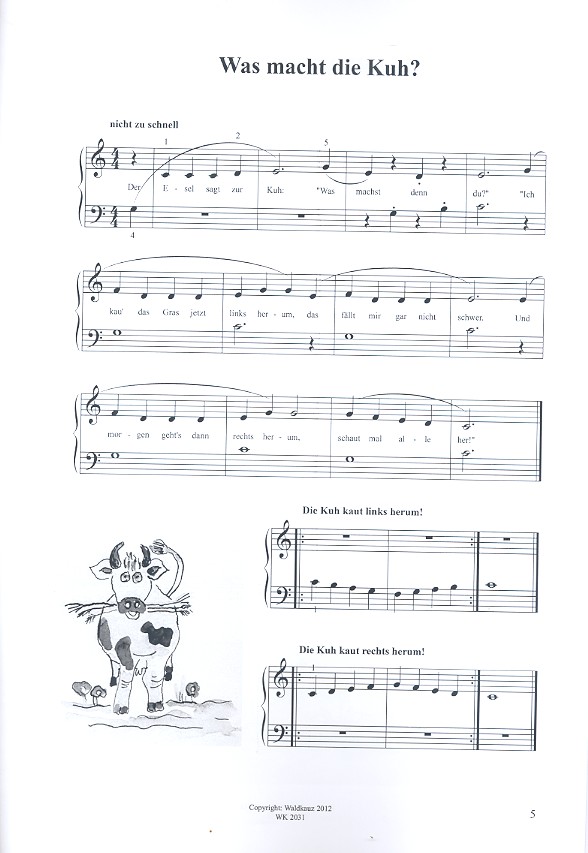 Leichte Klavierstücke Was macht die Kuh Die Wühlmäuse sind los Schneckenwanderung Hugo das Schwein Wildes Pony Krachkonzert bei Hahn Caruso Das Faultier in der Hängematte Vogel Strauß Spinnentanz Dialog der Kakerlaken Tanz der Seesterne Der Koi aus China Das Krokodil Die muntere Bachforelle Die Echse die vom Sofa sprang Fledermaus Blues Schneehasen Boogie Tarantel Tarantella Alarim im Fuchsbau Der Wolf jagt