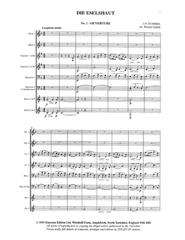 | Untertitel: | 2 Klarinetten, 2 Fagotte, Kontrafagott und 2 Hörner, Partitur und Stimmen |