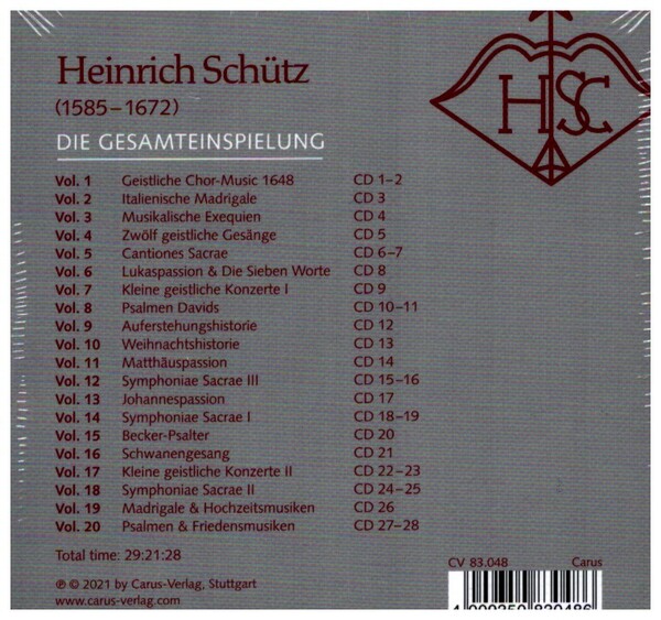 Die Heinrich-Schütz-Gesamteinspielung mit dem Dresdner Kammerchor unter Leitung von Hans-Christoph Rademann hat künstlerisch und editorisch neue Maßstäbe gesetzt. Nun erscheint zum 350. Todestag des Komponisten eine Box mit allen Folgen der vielfach ausgezeichneten Gesamteinspielung ein bedeutendes Klangdenkmal für einen Komponisten von Weltrang! Vol. 1 Geistliche Chor-Music 1648 (CD 12) Vol. 2 Italienische Madrigale (CD 3) Vol. 3 Musikalische Exequien (CD 4) Vol. 4 Zwölf geistliche Gesänge (CD 5) Vol. 5 Cantiones Sacrae (CD 67) Vol. 6 Lukaspassion & Die Sieben Worte (CD 8) Vol. 7 Kleine geistliche Konzerte I (CD 9) Vol. 8 Psalmen Davids (CD 1011) Vol. 9 Auferstehungshistorie (CD 12) Vol. 10 Weihnachtshistorie (CD 13) Vol. 11 Matthäuspassion (CD 14) Vol. 12 Symphoniae Sacrae III (CD 1516) Vol. 13 Johannespassion (CD 17) Vol. 14 Symphoniae Sacrae I (CD 1819) Vol. 15 Becker-Psalter (CD 20) Vol. 16 Schwanengesang (CD 21) Vol. 17 Kleine geistliche Konzerte II (CD 2223) Vol. 18 Symphoniae Sacrae II (CD 2425) Vol. 19 Madrigale & Hochzeitsmusiken (CD 26) Vol. 20 Psalmen & Friedensmusiken (CD 2728)