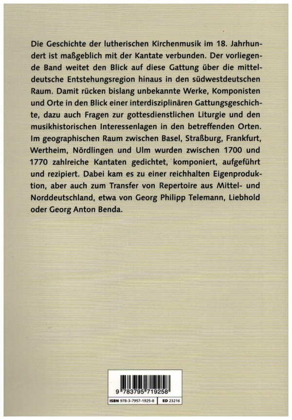 Stuttgarter Musikwissenschaftliche Schriften Band 6 Haag, Norbert, ed Holtz, Sabine, ed Kremer, Joachim, ed Der Band weitet den Blick auf die Kantate über die mitteldeutsche Entstehungsregion hinaus in den südwestdeutschen Raum. Hier wurden zwischen 1700 und 1770 zahlreiche Kantaten gedichtet, komponiert und aufgeführt. Bislang unbekannte Werke, Komponisten und Orte rücken in den Fokus. Vorwort - I. Die Kantate im kirchengeschichtlichen und frömmigkeitsgeschichtlichen Kontext Sabine Holz: Zur Rolle des Musikunterrichts in der Theologenausbildung des württembergischen Herzogtums Matthias Figel: Predigtgottesdienst und Kirchenmusik: eine Skizze der liturgischen Situation im evangelischen Sürwesten des 18. Jahrhunderts Konstanze Grutschnig-Kieser: 'Mit andächtigen Musiquen / in die Gemeinschafft der Auserwählten Himmels=Burger zu tretten'. Zur Einordnung des Davidschen Harpfen- und Psalter-Spiels von Johann Georg Christian Störl in den Pietismus II. Repertoire und Verbreitung Joachim Kremer: Der Südwesten als Kantatenlandschaft? Zur Überlieferung und Verbreitung einer Gattung. Mit Fallbeispielen von Telemann und Liebhold Irmgard Scheitler: Johann Georg Christian Störl als Cantaten- und Arienkomponist Christoph Öhm-Kühnle: Zum Inventar der Stiftskirche in Herrenberg von 1729-1730. Eine unbekannte Doppelkantatenbearbeitung von Erlebachs Jahrgang zu Neumeisters Das Wort Christi in Psalmen Gregor Richter: Zur süddeutschen Überlieferung von Georg Anton Bendas Münter-Jahrgang Sascha Wegner: '...nach der Musicalischen Invention' oder 'der Poesie'? Zum Kantatenschaffen des Straßburger Komponisten und Dichters Johann Christoph Frauenholtz III. Die Kantate in Baden und Württemberg - Rüdiger Thomsen-Fürst: Johann Philipp Käfer und die Kantatenaufführungen am Baden-Durlacher Hof in Karlsruhe 1717-1722 Helen Geyer: 'Care erbette' Arkadien im Norden: Johann Melchior Molter und die italienische Kantate Sarah-Denise Fabian: 'nicht wider die Evangelische(n) Lehrsätze'? Zur Kantatenproduktion am württembergischen Hof in Stuttgart und Ludwigsburg Nikolai Ott: '...und mit alpplauso aufgeführt' Georg Eberhard Duntz und seine beiden Kantatenjahrgänge am Stuttgarter Hof Verzeichnis der Abbildungen und Notenbeispiele Abkürzungen und Bibilothekssigel nach RISM Personenregister Ortsregister Die Autoren