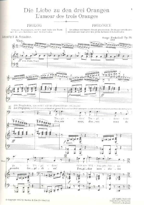 L'AMOUR DES TROIS ORANGES KLAVIERAUSZUG VOM KOMPONISTEN OPER IN 4 AKTEN UND EINEM PROLOG