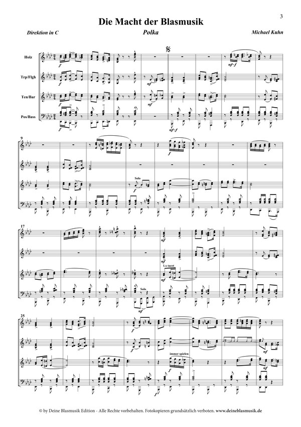 Polka Mit seiner Polka "Die Macht der Blasmusik" zeigt der Komponist und Arrangeur Michael Kuhn einmal mehr eindrucksvoll seine Rezeptur für ein neues Meisterwerk: Flügelhörner und Tenorhörner malen abwechselnd imposante Melodienbögen mit Gänsehautgarantie, untermauert von kräftigen und fundamentalen Bassfiguren. Ungewohnte Harmonien, plötzliche Dynamikwechsel, kräftige Bass-Soli und spritzige Klarinetteneinwürfe demonstrieren in diesem Stück die Bandbreite der traditionellen Blasmusik und beweisen, dass böhmische Blasmusik durchaus sehr anspruchsvoll und trotzdem leicht spielbar sein kann. Eine wahre Demonstration der Macht der Blasmusik!