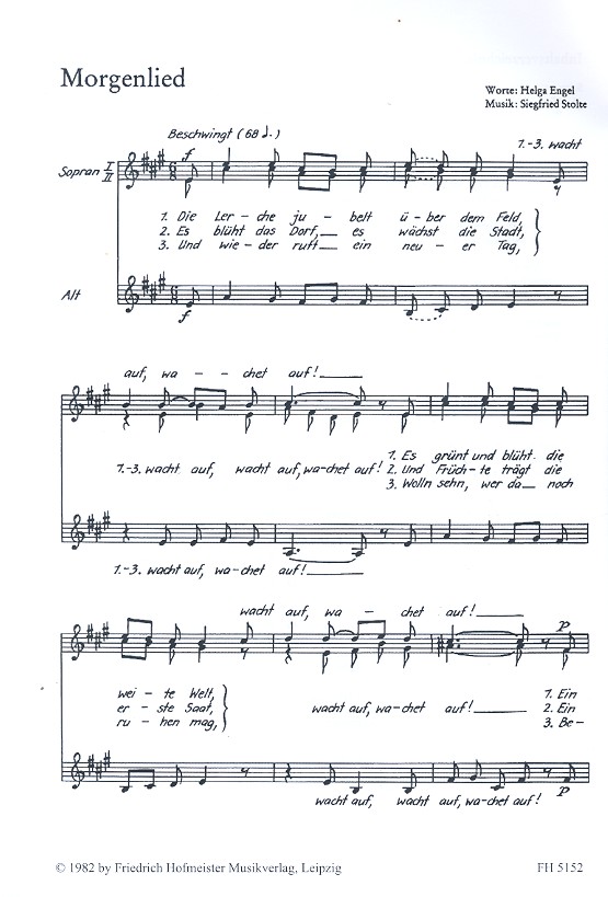 Zeitgenössische Chorlieder von Tages- und Jahreszeiten Morgenlied (Engel/Stolte) Guten Tag, du junger Morgen (Möskenthin/Lukowsky) Gedanken zum Tag (Hahn/Thurm) Eines milden Abends Bläue (Mandel/Irrgang) Der Abend deckt sein blaues Tuch (Lukowsky/Bimberg) Aus dem Wald am See (Möskenthin/Lukowsky) Da steht ein Apfelbaum (Scheer/Bimberg) Regen, komm, Sonne, komm (Schiffner/Fredrich) Doch in mir ist Sommerwetter (Fürnberg/Irrgang) Die Sonne nimmt uns bei der Hand (Möskenthin/Lukowsky), Querfeldein wandern (Streubel/Voigtländer) Kuckuck hat sich zu Tod gefallen (-/Domhardt) Wiese, grüne Wiese (Hacks, Voigtländer), Lagerfeuer am See (Möskenthin/Lukowsky) Trip, trip, trop (Hacks/Golle) Herbsteskommen (Fürnberg/Irrgang) Der Herbst steht auf der Leiter (Hacks/Golle) Schwalben auf Telegraphendrähten (Gabriel/Grabs) Der Baum (Braun/Grabs) Oktobertag (Pech/Bimberg) Novemberregen (Ruika-Franz/Domhardt) Auf die Straßen fällt ein Schnee (Möskenthin/Lukowsky) Winter macht uns nicht bange (Schiffner/Fredrich) Januarlied (Gabriel/Domhardt), Schneeflöckchen leise (Hacks/Voigtländer) Wäsche im Winter (Streubel/Irrgang)