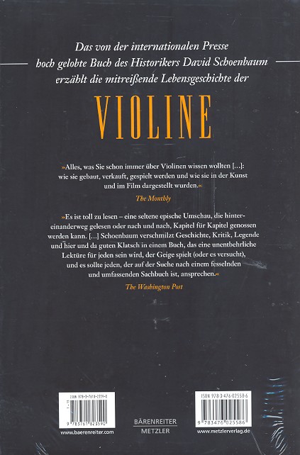 Nachfolgeausgabe: BVK4002 in Zusammenarbeit mit dem Verlag Metzler Das von der internationalen Presse hoch gelobte Buch des bekannten Historikers David Schoenbaum erzählt die Lebensgeschichte der Violine: wie sie, gebaut, verkauft, gespielt und wie sie in der Kunst dargestellt wurde. Entstanden ist dabei eine höchst originelle Gesamtdarstellung. Die Violine ist vielleicht das flexibelste Instrument, das je erfunden wurde. Für Weltmusik, Tanzmusik und Indie-Rock ebenso geeignet wie für Bach und Beethoven, wird es seit jeher im Stehen oder Sitzen gespielt, allein oder in Gruppen, in Bars, Kirchen, Konzertsälen und Rumpelkammern, von Profis und Amateuren, Erwachsenen und Kindern, Männern und Frauen und auf jedem Kontinent. David Schoenbaum hat unzählige Details über Hersteller, Händler und Spieler der Violine zusammengetragen und in einer umfassenden Geschichte der Violine gebündelt. Von den ersten Anfängen, als Geigenbauer ihr Handwerk von Kistenmachern lernten, über Stradivari und das Goldene Zeitalter von Cremona, die die Geige zu einem begehrten Sammlerstück machten, bis hin zu unvergleichlichen Künstlern wie Paganini, Joachim, Heifetz und Oistrach informiert Schoenbaum sachkundig und mitreißend über Kunst und Kultur des vielseitigsten Instruments der Welt.