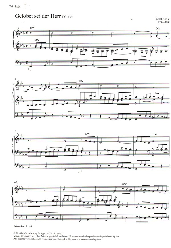 Choralvorspiele 6. Sonntag nach Trinitatis Ich sage Ja zu dem, der mich erschuf e-Moll Nagel, Matthias 5. Sonntag nach Trinitatis Jesus, der zu den Fischern lief d-Moll Bredenbach, Ingo / Mehrtens, Frits 6. Sonntag nach Trinitatis Ich bin getauft auf deinen Namen F-Dur Fischer, Michael Gotthard / König, Johann Balthasar 5. Sonntag nach Trinitatis Wach auf, du Geist der ersten Zeugen B-Dur Frenzel, Hermann Robert 4. Sonntag nach Trinitatis O Gott, du frommer Gott Es-Dur Muntschick, Johannes 4. Sonntag nach Trinitatis O Gott, du frommer Gott a-Moll Fischer, Michael Gotthard 4. Sonntag nach Trinitatis Komm in unsre stolze Welt dorisch Schlenker, Manfred 3. Sonntag nach Trinitatis Ich lobe meinen Gott, der aus der Tiefe mich holt D-Dur Lehmann, Christoph 3. Sonntag nach Trinitatis Jesus nimmt die Sünder an F-Dur Rinck, Johann Christian Heinrich / Ulich, Johann 2. Sonntag nach Trinitatis Komm, sag es allen weiter F-Dur Wollenschläger, Jens 1. Sonntag nach Trinitatis Ich steh vor dir mit leeren Händen, Herr F-Dur Gabriel, Thomas / Huijbers, Bernhard 1. Sonntag nach Trinitatis Von Gott will ich nicht lassen g-Moll Bredenbach, Ingo / Stobaeus, Johannes Trinitatis Brunn, alles Heils, dich ehren wir G-Dur Michel, Johannes Matthias / Bourgeois, Loys Trinitatis Gelobet sei der Herr Es-Dur Köhler, Ernst / Crüger, Johann 10. Sonntag nach Trinitatis Nun danket Gott, erhebt und preiset D-Dur Bredenbach, Ingo 24. Sonntag nach Trinitatis Mitten wir im Leben sind phrygisch Mayr, Johannes / Walter, Johann 31. Oktober-Gedenktag der Reformation Nun freut euch, lieben Christen g'mein F-Dur Hoyer, Karl / Luther, Martin 7. Sonntag nach Trinitatis Brich dem Hungrigen dein Brot g-Moll Brand, Helmut Michael / Häußler, Gerhart 8. Sonntag nach Trinitatis Lass uns in deinem Namen, Herr d-Moll Mayr, Johannes / Rommel, Kurt Sonne der Gerechtigkeit D-Dur Reimerdes, Friedrich 9. Sonntag nach Trinitatis Herzlich lieb hab ich dich, o Herr G-Dur Fischer, Michael Gotthard Die Erde ist des Herrn d-Moll Nagel, Matthias / Nagel, Matthias Text: Rieß, Jochen 10. Sonntag nach Trinitatis Lobt und preist die herrlichen Taten F-Dur Göttsche, Gunther Martin / Deiss, Lucien 10. Sonntag nach Trinitatis Aus tiefer Not lasst uns zu Gott G-Dur Bredenbach, Ingo / Dachstein, Wolfgang 10. Sonntag nach Trinitatis Und suchst du meine Sünde dorisch Wollenschläger, Jens / Boßler, Kurt 11. Sonntag nach Trinitatis Aus tiefer Not schrei ich zu dir phrygisch Reda, Siegfried / Luther, Martin 11. Sonntag nach Trinitatis Meine engen Grenzen d-Moll Heurich, Winfried 12. Sonntag nach Trinitatis Nun lob, mein Seel, den Herren G-Dur Fischer, Michael Gotthard / Kugelmann, Hans 12. Sonntag nach Trinitatis Wir haben Gottes Spuren festgestellt d-Moll Bredenbach, Ingo 13. Sonntag nach Trinitatis Wenn das Brot, das wir teilen, als Rose blüht C-Dur Grahl, Kurt 13. Sonntag nach Trinitatis So jemand spricht: Ich liebe Gott C-Dur Oley, Johann Christoph / Gesius, Bartholomäus / Schein, Johann Hermann 14. Sonntag nach Trinitatis Danket dem Herrn! Wir danken dem Herrn B-Dur Brand, Helmut Michael / Schulz, Karl Friedrich 14. Sonntag nach Trinitatis Lobe den Herrn, meine Seele F-Dur Brand, Helmut Michael / Kissel, Norbert 15. Sonntag nach Trinitatis Wer nur den lieben Gott lässt walten g-Moll Neumark, Johann Georg / Knödel, Carl 15. Sonntag nach Trinitatis Solang es Menschen gibt auf Erden Janca, Jan / Marez Oyens, Tera de 16. Sonntag nach Trinitatis Jesus lebt, mit ihm auch ich B-Dur Fischer, Michael Gotthard 16. Sonntag nach Trinitatis Gelobt sei deine Treu G-Dur Bredenbach, Ingo / Petzold, Johannes 17. Sonntag nach Trinitatis Such, wer da will, ein ander Ziel D-Dur Bredenbach, Ingo / Stobaeus, Johannes 17. Sonntag nach Trinitatis Mit dir, o Herr, die Grenzen überschreiten F-Dur Brand, Helmut Michael / Trunk, Roger 18. Sonntag nach Trinitatis Lass mich, o Herr, in allen Dingen B-Dur Fischer, Michael Gotthard 18. Sonntag nach Trinitatis Lass uns den Weg der Gerechtigkeit gehen e-Moll Michel, Johannes Matthias / Halffter Jiménez, Cristobal 19. Sonntag nach Trinitatis Ich singe dir mit Herz und Mund F-Dur Wollenschläger, Jens / Crüger, Johann / Davantès, Pierre 19. Sonntag nach Trinitatis Da wohnt ein Sehnen tief in uns d-Moll Brand, Helmut Michael / Quigley, Anne 20. Sonntag nach Trinitatis Wohl denen, die da wandeln G-Dur Michel, Johannes Matthias / Schütz, Heinrich 20. Sonntag nach Trinitatis Meinem Gott gehört die Welt F-Dur Johannsen, Kay / Lahusen, Christian 21. Sonntag nach Trinitatis Zieh an die Macht, du Arm des Herrn F-Dur Peter, Herbert / Vulpius, Melchior Choralvorspiel Damit aus Fremden Freunde werden F-Dur Schweizer, Rolf 22. Sonntag nach Trinitatis Herz und Herz vereint zusammen F-Dur Blitsch, Bernhard 22. Sonntag nach Trinitatis Wo Menschen sich vergessen F-Dur Lehmann, Christoph 23. Sonntag nach Trinitatis Ist Gott für mich, so trete c-Moll Kunkel, Lilo 23. Sonntag nach Trinitatis Gib Frieden, Herr, gib Frieden d-Moll Kennel, Günter / Gesius, Bartholomäus 24. Sonntag nach Trinitatis Auf meinen lieben Gott e-Moll Kittel, Johann Christian / Regnart, Jacobus Drittletzter Sonntag des Kirchenjahres Wir warten dein, o Gottes Sohn F-Dur Bach, Johann Sebastian / Gastorius, Severus [Bea:] Hoffmann, Gunther Orgelbegleitsatz Es wird sein in den letzten Tagen h-Moll Schlenker, Manfred Vorletzter Sonntag des Kirchenjahres Es ist gewisslich an der Zeit G-Dur Kittel, Johann Christian / Luther, Martin Vorletzter Sonntag des Kirchenjahres Es mag sein, dass alles fällt e-Moll Geilsdorf, Paul / Michel, Johannes Matthias Wachet auf, ruft uns die Stimme C-Dur Kittel, Johann Christian / Nicolai, Philipp Letzter Sonntag des Kirchenjahres: Ewigkeitssonntag Der Himmel, der ist, ist nicht der Himmel, der kommt e-Moll Heurich, Winfried Letzter Sonntag des Kirchenjahres: Totensonntag Jesus, meine Zuversicht B-Dur Fink, Christian 24. Juni Tag der Geburt Johannes des Täufers (Johannis) Wir wollen singn ein' Lobgesang d-Moll Brand, Helmut Michael / Gesius, Ba