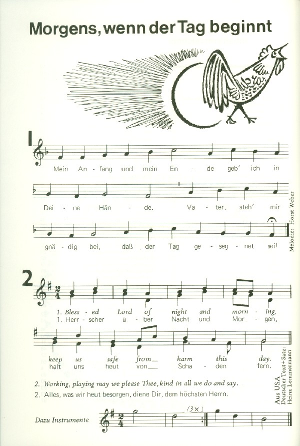 10 x 9 neue Lieder für Kinder Band 1 (Grundschule) Alouette (aus Kanada) Als Nikolaus Bischof von Myra war Am 25. Dezember (aus Spanien) Auf dem Markt zu Bückeburg Auf der Kirmes (aus Estland) Auf grünem Blatt am Baum (aus Panama) Bei den Wirags (aus Ungarn) Bitte, gib mir doch ein Zuckerstückchen (Ponypferdchen, Refrain: Weit übers Land wird mein Pferdchen heute traben) - aus Portugal Blessed Lord Bullermann und Kullermann Christ ist geboren (aus Polen) Dachdeckermeister Schwindelfrei Der Herbst, der Herbst ist da Der Müller hat ein Mühlenhaus Die Kuh, die saß im Schwalbennest Drei kleine Kinder (aus den USA) Durch die Straßen auf und nieder Eben hat es acht geschlagen Ei, Müller, deine Mühl (aus Frankreich) Eine alte, dicke Ente geht nicht gerne schnell Ein Elefant wollt bummeln gehn (aus den USA) Ein Licht auf meinem Wege Frankfurt am Main Für ein paar Groschen (aus Venezuela) Ging einmal im Regen Grüß Gott, du schöner Maie Guten Morgen, Herr Bäcker Guten Morgen, hier beisammen Guten Morgen, liebe Sonne, guten Morgen lieber Tag Hab ich ein paar Bären (Jiddisches Volksgut) Halli - Hallo - Halunken Hampelmann strampeln kann Hei, mein Pferdchen läuft geschwind Hei, so sausen wir Herrscher über Nacht und Morgen (aus den USA) Holler, boller, Rumpelsack Ich hab eine feine Laterne Im Getreide dort am Hange (aus Ungarn) In Eis und Schnee (aus England) In Holland, wo die Mühlen stehn (Kater Jan) - aus Holland Jeden Morgen steigt die Sonne über unsern Dächern auf Jungfer Sabinchen Kein Tierlein ist auf Erden Kommet all und seht, vor dem Hause steht (Der Schneemann) Leute, seht mal an Licht in der Laterne, ich geh mit dir so gerne Liebe Erde, gute Erde Liebe Lerche Liebe Leute, laßt euch sagen, was sich jüngstens zugetragen Lieber Bauer, sei so gut Ma come balli bella bimba Mädchen, darf ich mit dir gehn (aus Holland) Marmelade, Schokolade Mein Anfang und mein Ende Meinem Gott gehört die Welt Miezekätzchen (aus Frankreich) Morgens, wenn der Tag beginnt Musikanten, die kommen Musikanten, warum schweigt ihr (aus der Tschechoslowakei) Nach Paris-Parin-Paran, Onkel Jörg hat einen Bauernhof (aus England) Rab,rab,rab Rumpumpel macht 'ne Landpartie Ru, ru, risch Sag mir, du Siebenschläferlein Schickt mich die Mutter (aus Norwegen) Schornsteinfeger ging spazier'n Schornsteinfeger, schwarzer Mann Schreckliche Hitzsss! Seht ihr die alte Mühle stehn Sei willkommen in unserm Kreis Sennerin, kleine (aus Schweden) Setz den Teig mit Honig an So tanzen wir wie Bella Bimba (aus Italien) Soviel Blümlein in den Feldern Stand ein Birkenbaum (aus Rußland) Sur le pont d'Avignon (aus Frankreich) Three li'l chillun Tischlein, deck dich, Esel Trara, der Feuerwehrmann Trat ich heute vor die Türe, sapperlot, was sah ich da ( Gans Agathe - Truthahn - Cha-Cha-Cha ) Vier Häschen kamen angetrappelt Vom Himmel fällt der Regen War ich von stattlicher brauner Gestalt Was tun wir denn so gerne Wenn der Schnee zerrinnt Wenn du mit uns tanzen willst Werft 'nen Heller (aus Jugoslawien) Wer hat Meiers Hund gesehn Wer kauft mir einen Hahn Wie bin ich froh, wenn Weihnacht ist Wind, Wind, sause Wir sagen euch an den lieben Advent Wir sind die wohlbekannten, lustigen Bremen Stadtmusikanten Wir Tierlein in dem Stalle Wer hat Meiers Hund gesehen