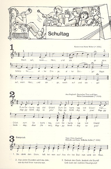 Neue Lieder für die Jugend (5.-13. Schuljahr) Abend ward, bald kommt die Nacht Ade, ade, ade, bleibt alle munter und schön - Kanon Als wir noch in der Wiege lagen - Kanon Aprite le porte - aus Italien Atte katte nuwa - aus Lappland Bedenk den Stein, laß keinen aus - Hausspruch Bleib bei uns, wenn der Tag entweicht Bon soir - Kanon aus Frankreich Bunt sind schon die Wälder - Kanon Christus ist geboren - aus Polen Cotton needs a picking so bad - aus den USA Cowboy muss reiten Das Jagdhorn klingt - Kanon aus Frankreich De angel roll de stone away - aus den USA Der Jahrmarkt hat begonnen Der Kaiser Alexander Der Karneval ist gekommen - aus Argentinien Der Leo-, der Leo-, der Leopard hat Flecken Der Mensch lebt und bestehet nur eine kleine Zeit Der Sommer erfreut das Gestade und Land - aus Schweden Der Winter ist vergangen - aus Holland Der Winter kommt mit Grimme Die Cucaracha Die Sonne lacht und die Vögel rufen Dumla dumla dumladi - Kanon aus Holland Ehre sei Gott - Kanon Engel haben Himmelslieder - aus Frankreich Ein Ele-Zwele-Trelefant Ein Frosch ist keine Nachtigall Ein Nilpferd tät still in die Wüste gehn Ein Vogel saß auf einem Baum Ev'ry person Es weht ein Wind - aus Schweden Für heute eine gute Nacht - Kanon Gebt einen Groschen für den Leierkastenmann (hurdygurdyman) - aus den USA Gehe ein in deinen Frieden - aus Israel Glück und Freud Go tell it to the mountain - aus den USA Guten Abend - Kanon aus Frankreich Hab mein Wagen vollgeladen - aus Holland Happy birthday to you Hark! The herold angels sing Hava, nagila hava - aus Israel Herr Christe, komm in unsre Nacht Herr Gott, sei unser Gast - Kanon Herr, laß auf Erden - Kanon Herr Winter stammt vom Kaukasus Hevenu shalom - aus Israel Hinaus, hinaus, die Schule ist aus - Kanon Hört der Engel Chor von fern - aus England Ich steh hier vor der Tür - aus Südafrika Ich will den Namen Gottes loben - Kanon In Gottes Namen scheiden wir Ja, ich bin aus Krakau - aus Polen Ja, wir tanzen La Bamba - aus Mexiko Jedermann im ganzen Lande (Pfeifer Tim) - aus Irland Joshua fit de battle - aus den USA Kad su se diva - aus Jugoslawien Klopfe heftig, klopfe kräftig La Cucaracha Lang sollst du leben - Kanon Läutet uns zum Frieden - Kanon Leis der Wind im Abend weht - Kanon aus Ungarn Lerne sparen, leiste was Leute habt ihr schon einmal probiert eine Boogie - Woogie Maria durch ein Dornwald ging Nehmt Abschied, Brüder - aus Schottland Nun ist vorbei die finstre Nacht Oh when the saints go marching in - aus den USA One little copper Over the prairie the cowboy will ride - aus den USA O Stern, den ich anbete - aus Frankreich Reibekuchen, Reibekuchen Sag, wann gehn wir endlich - aus Südafrika Sascha geizte mit den Worten - aus Rußland Schön ist die Welt, drum Freunde laßt uns reisen Shalom chaverim - Kanon aus Israel So jemand spricht So lang der Mond am Himmel Swing low, sweet chariot - aus den USA U gonni Und wolln wir zusammen die Mahlzeit verbringen Uns locken die sonnigen Tage - aus Schweden Von guten Mächten wunderbar geborgen Von Pappe ist die Erde Vor der Insel Madagaskar Wach auf mein Herz und singe - Kanon Way down upon the Swanee River - aus den USA Wenn der Ochsenwagen übers Land treckt - aus Südafrika Wiegende Welle auf wogender See Will ein lustig Liedlein bringen - aus Italien Willkommen, die gehen ein und aus Wir danken Euch Wir grüßen euch mit fröhlichem Gesang - Kanon Wir kamen einst von Piemont - aus Frankreich Wir möchten mit euch wetten - Kanon Wir pflügen und wir streuen den Samen Wir wollen Frieden Zumba, zumba, welch ein Singen - aus Spanien Zum Geburtstag viel Glück - aus England Zwei junge Männer schlendern durstig - aus Jugoslawien
