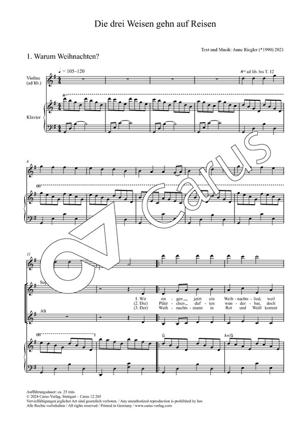 Ein Krippenspiel mit Witz und Stil Warum feiern wir überhaupt Weihnachten? Mit viel Humor, Wortwitz und ohrwurmträchtigen Songs geht Anne Riegler in ihrem neuen Musical dieser Frage nach. Hauptakteure sind die drei Weisen, die von fern einem Stern folgen, um einen König zu finden. Dabei entdecken sie nicht nur den Ursprung einiger unserer heutigen Weihnachtstraditionen, sondern letztlich auch den Sinn von Weihnachten: das Kind in der Krippe, Gottes Sohn in Menschengestalt. Das kurzweilige Musical eignet sich für Kinder und Jugendliche von etwa 6 bis 15 Jahren. Es kann ein- oder zweistimmig aufgeführt werden. Mit 25 Minuten Aufführungsdauer passt es perfekt in einen Weihnachtsgottesdienst. Als Instrumentalbegleitung ist ein Klavier vorgesehen, eine Violin-Oberstimme kann hinzutreten und verleiht zusätzliche Farbe.