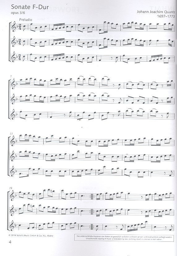 Landgraf, Gefion, ed Leichte Lieder und Stücke Preludio (Quantz) Prélude (M.A. Charpentier) Gavotte en Rondeau (J.B. de Boismortier) Tango für Träumer (R. Mauz) The Sycamore (Joplin) The Entertainer (Joplin) Peacherine Rag (Joplin) Deutschlandlied (Haydn) Nationalhymne von Österreich (Mozart) Allegro moderato (Hook) Reigen seliger Geister (Gluck) Frischer Wind (Mauz) Frisch auf (Mauz) Engels Terzett (Mendelssohn) Adagio (CPE Bach) Näher mein Gott zu dir (Mason) Treulich geführt (Wagner) Bald prangt, den Morgen zu verkünden (Mozart) Andantino (Chatschaturian) Schott's Joplin (Searle) Geburtstagsständchen (Maus) Chossn Kalah Mazel Tov (Traditional) Sherele (Traditional) Siman Tov (Traditional) Eine kleine Nachtmusik (Mozart) Eine swingende Nachtmusik (Mauz) Trio D-Dur (Quantz) Pastorale (Corelli) Kanon (Pachelbel) Veronika, der Lenz ist da (Jurmann) Annen-Polka (Strauss)