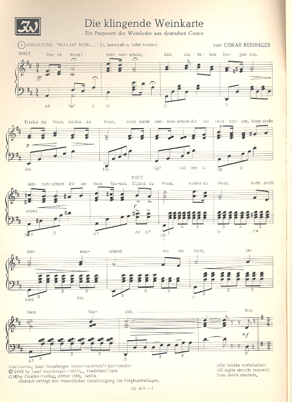 Reisinger, Oskar, Bearb. Was ist Wein Was bringen uns die Reben Rheinweinlied Im goldnen Löwen war's zu Sankt Goar Es liegt ein Faß in Heidelberg An der Ahr Herrgott am blühenden Neckarstrand Frankenweinlied Das war der Zwerg Perkeo Im tiefen Keller sitz ich hier Im Krug zum grünen Kranze Weinbeisser Marsch In der Pfalz blühen unsre Reben O Mosella