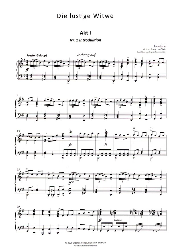 Operette in 3 Akten von Victor Léon und Leo Stein - überarbeitete, vollständigere Reduktion der Orchesterpartitur für Gesang und Klavier - Einbindung sonst meist weggelassener musikalischer Elemente, wie z.B. die Nebenmelodie im Duett Lippen schweigen - Einbindung wichtiger instrumentaler Einwürfe für das Studium von Gesangspartien auf gesonderten Notensystemen - für Probenarbeit und Aufführung