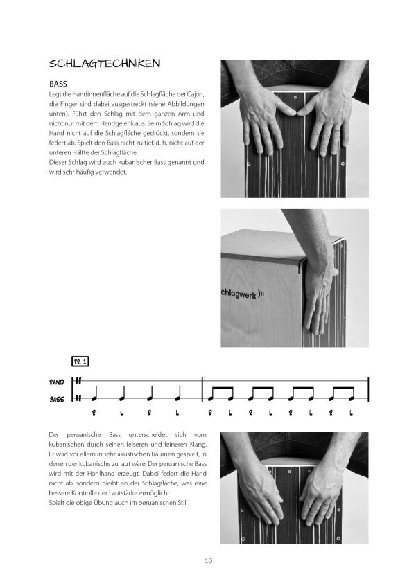 Basis Spieltechniken Grooves mit Musikbeispielen Mit diesem Buch lernt ihr die Grundtechniken zum Spielen der Cajon wie auch ausgewählte Weltrhythmen kennen. Jedes Notenbeispiel ist entsprechend gekennzeichnet und kann auf der Website angeschaut werden. So bekommt ihr eine Vorstellung vom Rhythmus und von der Spielweise und auch der Lerneffekt ist größer. Zudem gibt es für jeden Rhythmus auch ein Musikbeispiel, das ihr auch als Playalong verwenden könnt.