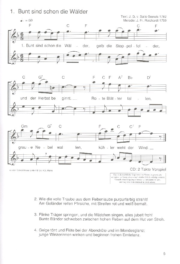 Magolt, Marianne, ed Bunt sind schon die Wälder Hejo spann den Wagen an Wind Wind sause Der Herbst ist da Drachenlied Regenlied Der Nussbaum Spannenlanger Hansel Laterne, Laterne Ich geh mit meiner Laterne Durch die Strassen auf und nieder St. Martin Lasst uns froh und munter sein Morgen kommt der Weihnachtsmann Wir sagen euch an Dicke rote Kerzen Es kommt ein Schiff geladen Rudolph the red nosed reindeer In der Weihnachtsbäckerei Juche der erste Schnee Schneeflöckchen Weissröckchen Abc die Katze lief im Schnee Es ist für uns eine Zeit angekommen Aber heidschi bumbeidschi Winter Wonderland Und in dem Schneegebirge Ach bittrer Winter Der Bratapfel Nehmt Abschied Brüder Schnee eilt die Zeit Wir kommen daher aus dem Morgenland Die heiligen drei Könige