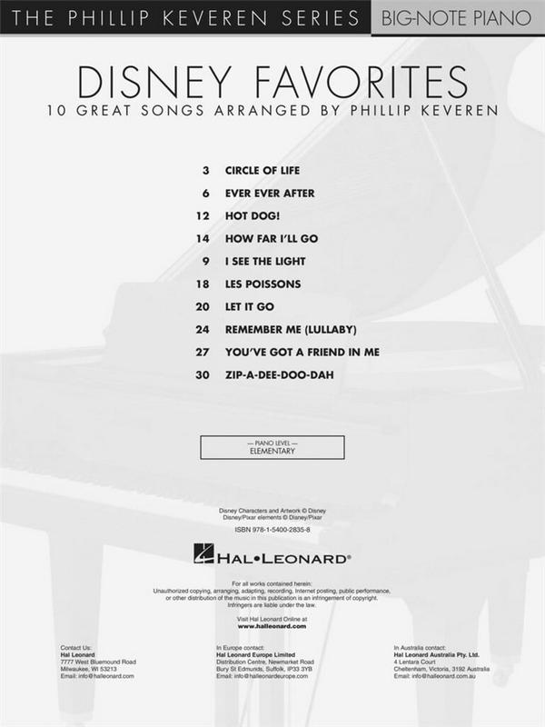 The Philip Keveren Series Keveren, Phillip, arr. 10 great Songs Circle of Life Ever ever after Hot Dog How far I'll go I see the Light Les poissons Let it go Remember me (Lullaby) You've got a Friend in me Zip-a-dee-doo-dah
