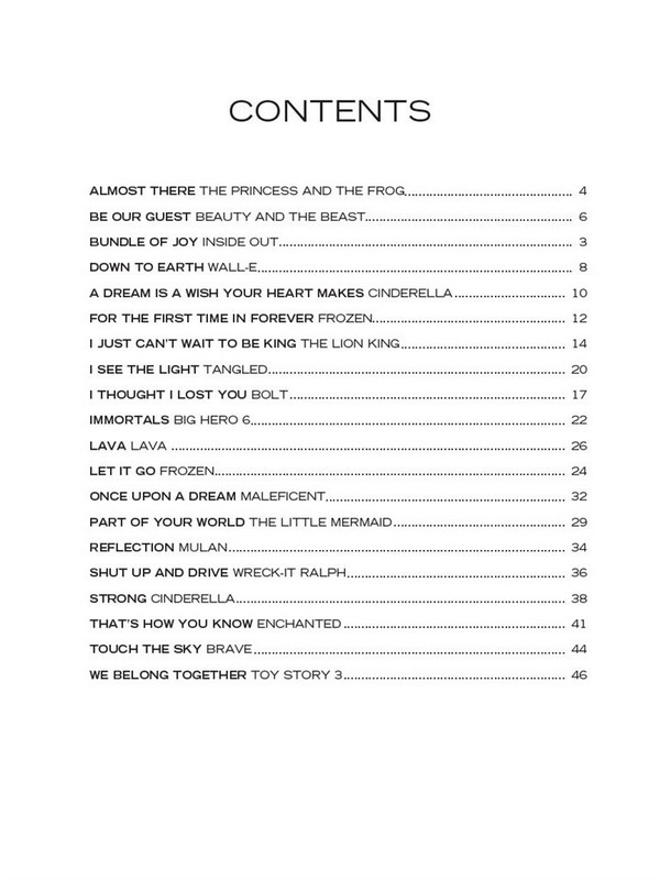 20 Disney Favourites Almost There (The Princess And The Frog) Be Our Guest (Beauty And The Beast) Bundle Of Joy (Inside Out) Down To Earth (WALL-E) A Dream Is A Wish Your Heart Makes (Cinderella) For The First Time In Forever (Frozen) I Just Can't Wait To Be King (The Lion King) I See The Light (Tangled) I Thought I Lost You (Bolt) Immortals (Big Hero 6) Lava (Lava) Let It Go (Frozen) Once Upon A Dream (Maleficent) Part Of Your World (The Little Mermaid) Reflection (Mulan) Shut Up And Drive (Wreck-It Ralph) Strong (Cinderella) That's How You Know (Enchanted) Touch The Sky (Brave) We Belong Together (Toy Story 3)