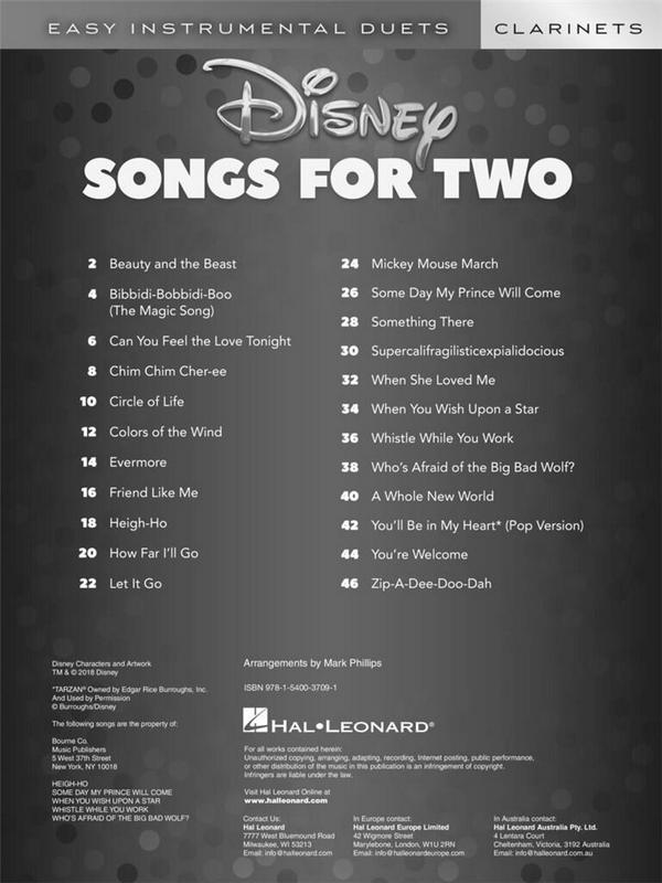 Easy instrumental Duets 23 Disney Favorites Beauty And The Beast (from BEAUTY AND THE BEAST) Bibbidi-Bobbidi-Boo (The Magic Song) (from CINDERELLA) Can You Feel The Love Tonight (from THE LION KING) Chim Chim Cher-ee (from MARY POPPINS) Circle Of Life (from THE LION KING) Colors Of The Wind (from POCAHONTAS) Evermore (from BEAUTY AND THE BEAST) Friend Like Me (from ALADDIN) Heigh-Ho (The Dwarfs' Marching Song from SNOW WHITE AND THE SEVEN DWARFS) How Far I'll Go (from MOANA) Let It Go (from FROZEN) Mickey Mouse March (from THE MICKEY MOUSE CLUB) Some Day My Prince Will Come (from SNOW WHITE AND THE SEVEN DWARFS) Something There (from BEAUTY AND THE BEAST) Supercalifragilisticexpialidocious (from MARY POPPINS) When She Loved Me (from TOY STORY 2) When You Wish Upon A Star (from PINOCCHIO) Whistle While You Work (from SNOW WHITE AND THE SEVEN DWARFS) Who's Afraid Of The Big Bad Wolf? (from THREE LITTLE PIGS) A Whole New World (from ALADDIN) You'll Be In My Heart (Pop Version)* (from TARZAN TM) You're Welcome (from MOANA) Zip-A-Dee-Doo-Dah (from SONG OF THE SOUTH)