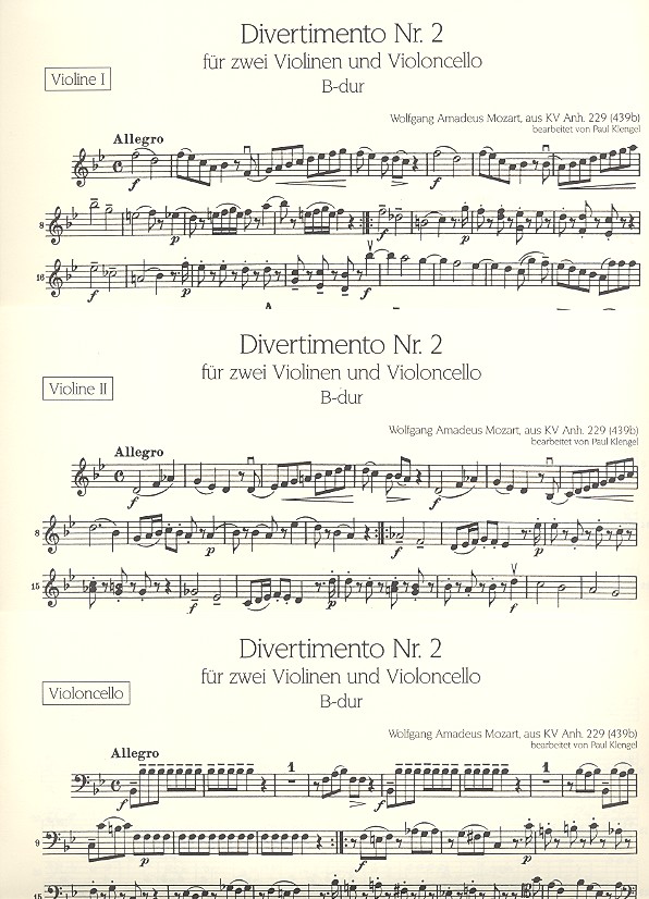 Klengel, Paul, ed KV439b Wie bei Ludwig Güttler und seinen Trompete und Orgel-Heften liefern hier bekannte Solisten nach der hochwertigen Schallplatteneinspielung die Notenausgabe: Sabine Meyer, Wolfgang Meyerund Reiner Wehle, die neben ihren solistischen Aufgaben im Trio di Clarone zusammengefunden haben, engagieren sich nun für ein werkgerechtes, praxisnahes Spielmaterial. Das Divertimento Nr. 2 steht am Anfang unserer grundlegenden Neuausgabe der fünf Mozart-Divertimenti KV Anh. 229 (439 b), die original für drei Bassetthörner gedacht waren. Gleichwohl sollen die bekannten Stücke natürlich auch in der schon zu Beginn des 19. Jahrhunderts üblichen Besetzung 2 Klarinetten und Fagott spielbar bleiben. Zusätzlich ist die Ausführung für drei Klarinetten möglich, um die bekannten Divertimenti auch dem instrumentalen Gruppenunterricht zugänglich zu machen.