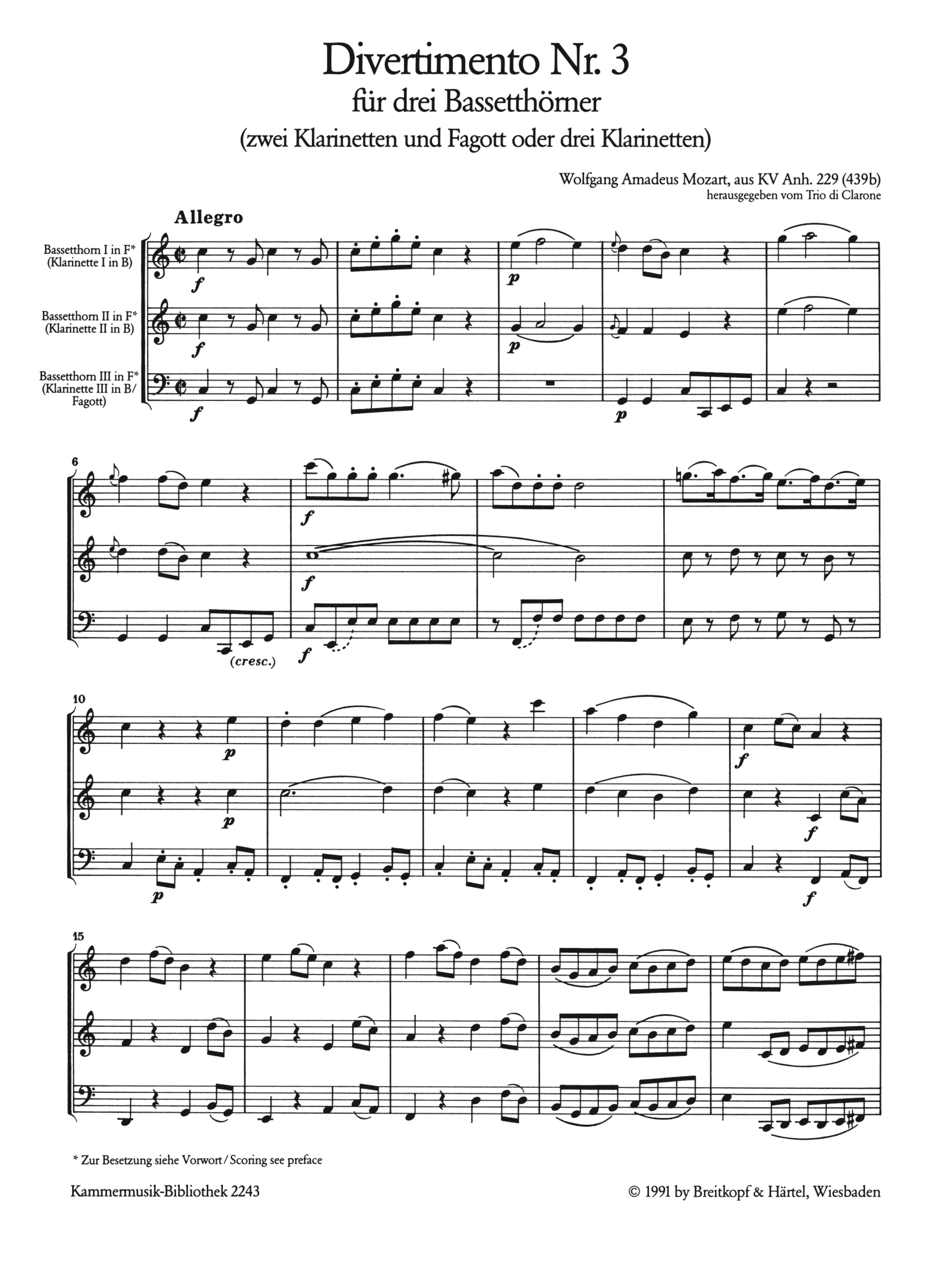 | Untertitel: | für 3 Bassetthörner (2 Klarinetten und Fagott) Partitur und Stimmen |