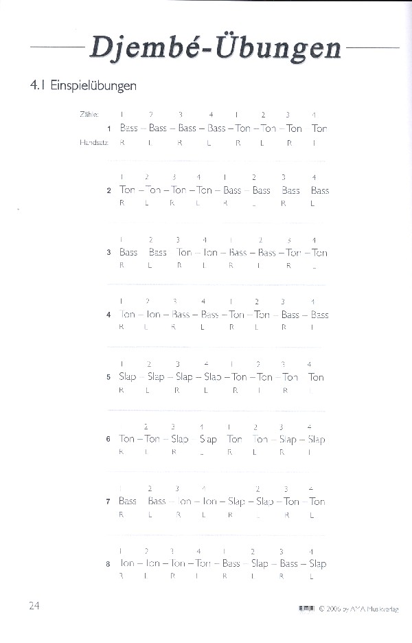 Djembespiel Djembe Spiel Was für mich einst als Stellvertretungsjob (Schlagzeug- und Perkussionslehrer) an einer Jugendmusikschule begann, entwickelte sich mehr und mehr zu meiner Leidenschaft: DAS DJEMBÉ-SPIEL IM GRUPPEN-UNTERRICHT! Was will ich mit diesem Lehrmittel erreichen? Ist es möglich, dieses bei uns lange unbekannte Instrument einfach und schnell zu lernen? Was für neue Ideen und Visionen gibt es zum Thema DJEMBÉ-SPIEL? Mit diesem Lehrmittel will ich meine Erfahrungen und Erkenntnisse im Djembé-(Gruppen-)Unterricht aufzeigen. Zudem soll das dargelegte pädagogische Lernkonzept allen Anfängern, Fortgeschrittenen und Wiedereinsteigern zu einem erfolgreichen Erlernen des Djembé-Spiels verhelfen. Schwerpunkt Gruppenunterricht Durch die Leidenschaft zum Djembé-Spiel im Gruppenunterricht hat der Schweizer Alexander Kästli mit Djembé-Spiel eine Schule für Anfänger, Fortgeschrittene und Wiedereinsteiger geschrieben. Mit dieser Schule schafft der Autor einen Übergang vom musikalischen Grundkurs zum Djembé- und Schlagzeugunterricht, da die Handtrommeln zu denen auch die Djembé gehört in vielen Ländern als Starthilfe für das Erlernen anderer Instrumente eingesetzt werden. Die Schule gliedert sich in einen Praxis- und einen Theorie-Teil. Im Theorie-Teil lernt der Schüler alles über das Instrument (Herkunft, Einsatzbereich und Material) und für den Lehrer gibt es ein separates Kapitel über das Thema Gruppenunterricht. Da der Schüler in der Gruppe Vergleichsmöglichkeiten zu anderen hat und damit Unterschiede in den Spielweisen beobachten und seine Eigene verändern kann, kann auch jeder Schüler eine Lehrfunktion übernehmen. Daher geht der Autor ausführlich auf Themen wie: Pädagogik, Lernziele, Rangordnung, Konkurrenz, Gruppengrößen und Konzentration ein. Denn im Gruppenunterricht geht es immer um das gemeinsame Musizieren, Kommunizieren und Motivieren. Im Praxis-Teil werden alle Grundspieltechniken in Noten, Wort, Bild und Ton erklärt. So geht es nach der Einführung zu Schlagtechniken, Spielpraxis und Zeichenerklärungen ans Spielen: nach den einfachen Djembé-Übungen geht es weiter mit Djembé-Grooves für Fortgeschrittene (16tel, Shuffle und Akzente) und Djembé-Melodien. Hier werden die traditionellen Standardbegleitungen von Musikformen wie Kondumba, Bambino, Bumba, Filia oder Déjá-vu vorgestellt und eingeübt. Eine CD dient als hilfreiche Orientierung bei der rhythmischen Umsetzung der Stücke. Ein separates Kapitel widmet sich der kindgerechten Rhythmussprache, die auch hier für den Lehrer pädagogisch wertvolle Tipps gibt: mit Hilfe von Silben und Wörtern werden rhythmische Zusammenhänge und Noten begreiflich gemacht. So ist diese Schule auch für kleine Kinder geeignet, die nach der Früherziehung an die Instrumentenwahl herangeführt werden sollen. Fazit: die Schule ist sprachlich ein sehr klarer und pädagogisch durchdachter Leitfaden für den Gruppenunterricht und kann von den Lehrern als Alternative zum Orff-Unterricht verwendet werden.