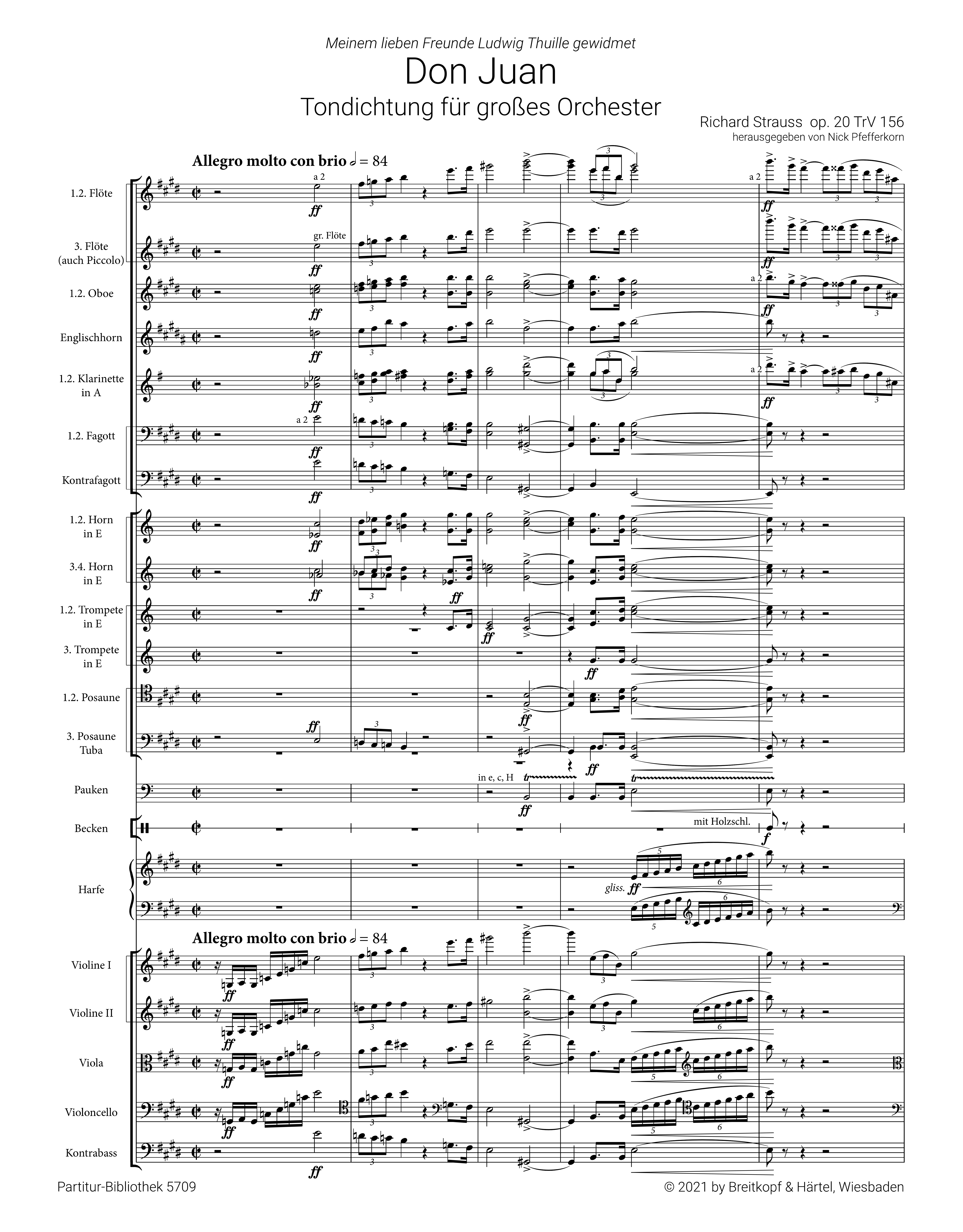 Pfefferkorn, Nick, ed Strauss' dritte Tondichtung entstand im Frühjahr 1888. Die Figur des Don Juan, des Frauenhelden, der keiner Versuchung widerstehen kann, doch gleichzeitig seines Lebens überdrüssig ist und in letzter Konsequenz den Tod findet, muss Strauss enorm fasziniert haben. Das Werk zeigt bereits eindrucksvoll Strauss neu gewonnene Sicherheit im Umgang mit dem Orchesterapparat und malt Don Juans Drama in den glühenden Farben des großen Symphonieorchesters. Schon im Herbst war das Werk fertig, und obwohl es bis zur Uraufführung am 11. November 1889 in Weimar noch über ein Jahr dauerte, änderte Strauss nichts mehr an seiner Partitur. Breitkopf & Härtels neue Urtextausgabe wertet neben dem Autograph und dem Erstdruck auch erstmals unter Leitung des Komponisten verwendete Stimmensätze (u.a. aus dem Archiv der New Yorker Philharmoniker) aus und kommt teils zu überraschend neuen Lesarten. Wie immer runden ein ausführliches Vorwort, Faksimile-Seiten und ein detaillierter kritischer Bericht diese maßgebliche Urtextausgabe ab.