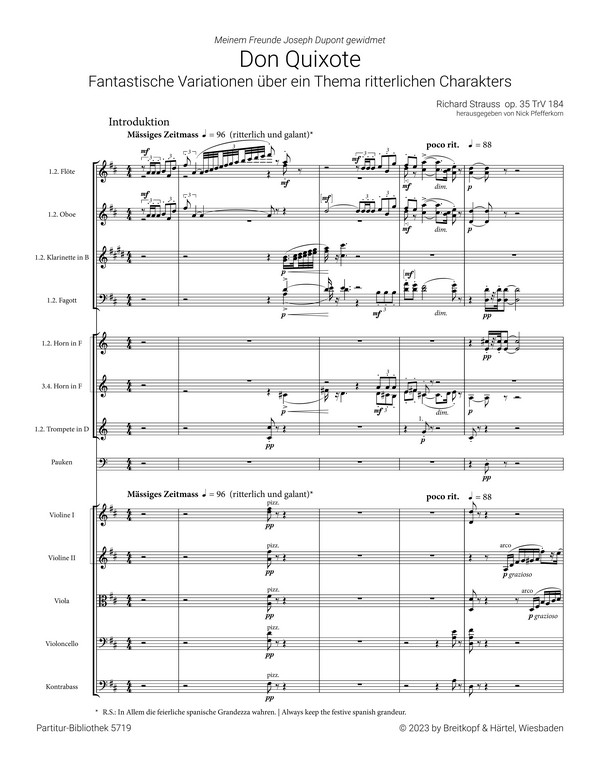 Fantastische Variationen über ein Thema ritterlichen Charakters Strauss hatte ursprünglich vorgesehen, den Don Quixote, wenn möglich, stets gemeinsam mit dem Heldenleben aufzuführen, ?da besonders Don Q. erst neben Heldenleben voll und ganz verständlich ist.? Bis heute wird diesem Wunsch Strauss? nur selten entsprochen. Die jetzt bei Breitkopf & Härtel erscheinende Urtextausgabe kann hier behilflich sein. Wiederum liegt der Neuausgabe Strauss? eigenhändige Stichvorlage zugrunde, die bei der Klärung zahlreicher Missverständnisse hilft und die Korrektur dutzender tradierter Fehler ermöglicht. Darüber hinaus erscheinen jetzt auch erstmals die Harmoniestimmen komplett gestochen ? diese waren nämlich bisher nur in handschriftlicher Form zugänglich. Zusätzlich ergänzen wir diese Neuausgabe mit einem Klavierauszug der wichtigsten Orchesterpassagen, die für das Studium der Stimmen für Solo-Violoncello und Solo-Viola hilfreich sind. Selbstverständlich liegen diesem käuflichen Klavierauszug die beiden Solostimmen auch separat bei.
