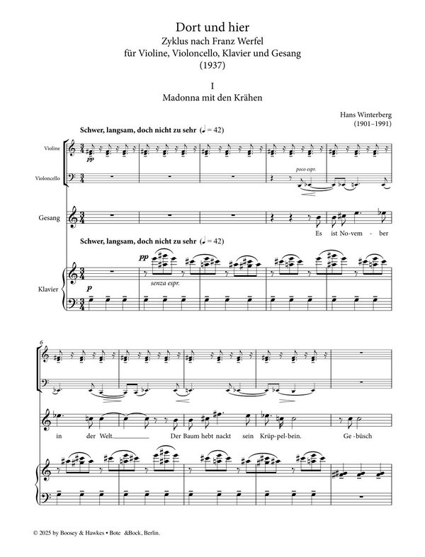 Zyklus nach Franz Werfel Hans Winterberg, 1901 in Prag geboren, gehörte zum assimilierten jüdischen Bürgertum der bis 1918 zur k. u. k. Monarchie gehörenden böhmischen Kulturmetropole, in der bis zur Mitte des 19. Jahrhunderts mehrheitlich Deutsch gesprochen wurde. Auf Deutsch publizierten die Prager Literaten Kafka, Rilke und Werfel. Und auch Winterberg, der nur wenige Meter vom Café Arco lebte, dem Treffpunkt der literarischen Avantgarde Prags, war in erster Linie deutschsprachig. Winterbergs literarischer Fixstern war Franz Werfel. Ihm widmete er mehrere Zyklen, wobei Dort und Hier einen Höhepunkt nicht nur unter seinen eigenen Liedvertonungen markiert es handelt sich um ein Meisterwerk der Gattung Vokalmusik mit Ensemble-Begleitung, vergleichbar den ähnlich besetzten, 10 Jahre zuvor entstandenen Chansons madécasses von Ravel. Winterberg wählte vier Gedichte Werfels aus unterschiedlichen Veröffentlichungen und verwebte sie raffiniert zu einem Zyklus, der sich in überraschenden Bildern mit Dingen des Diesseits und des Jenseits befasst. Kongenial findet Winterberg musikalische Entsprechungen zu Werfels lyrisch expressionistischen Tonfall, dem eine feine, surreal-ironische Note eingewoben ist, die so typisch ist für die tschechische Moderne der Zwischenkriegszeit.