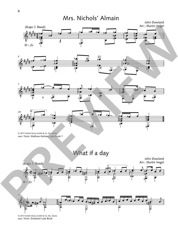 Hegel, Martin, arr. 24 Transkriptionen Mr. Dowland's Midnight Orlando sleepeth Mrs. Winter's Jump Mrs. Nichols' Almain What if a day Tarleton's Resurrection Preludium My Lord Willoughby's Welcome Home Fortune my goe Come away The King of Denmark's Galliard Captain Cavendish's Galliard Round battle Galliard The shoemaker's wif (A Toy) Mrs. Whit's Nothing Mrs. Vaux Galliard Lady Leighton's Almain Hasellwood's Galliard Lord Strang's March Dowland's Galliard Melancholy Galliard My Landy Hunsdon's Puffe (Allemande) The Frog Galliard Sir John Smith his Almain